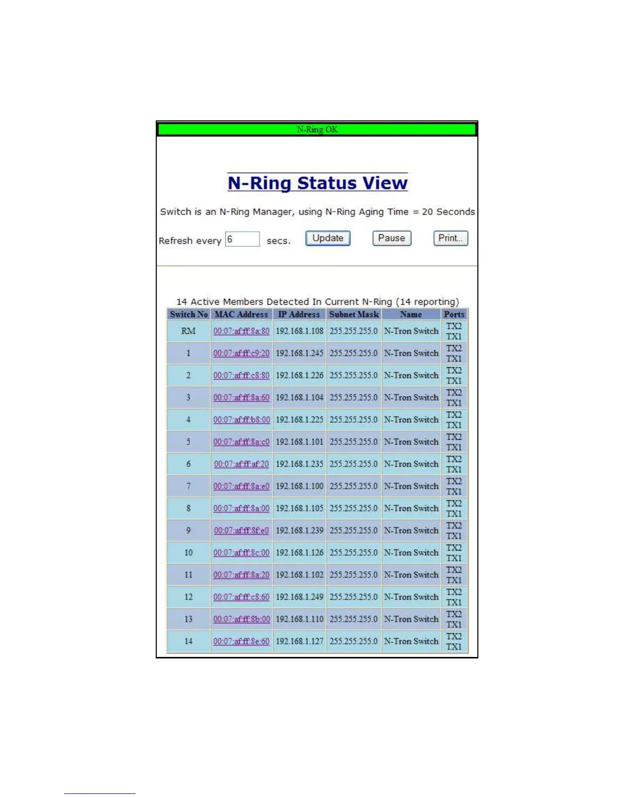 Below is an example of N-Ring Status from an N-Ring Manager with a healthy N-Ring: