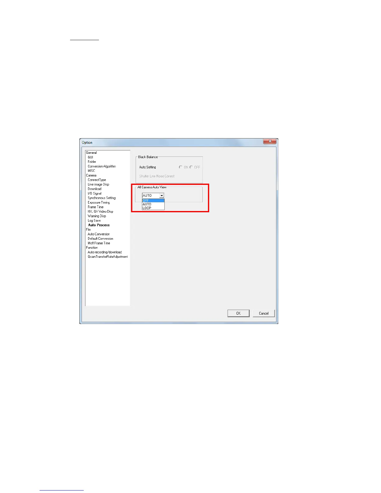 The auto view settings are made in “All Camera Auto View” in the “Option” dialogue and are set