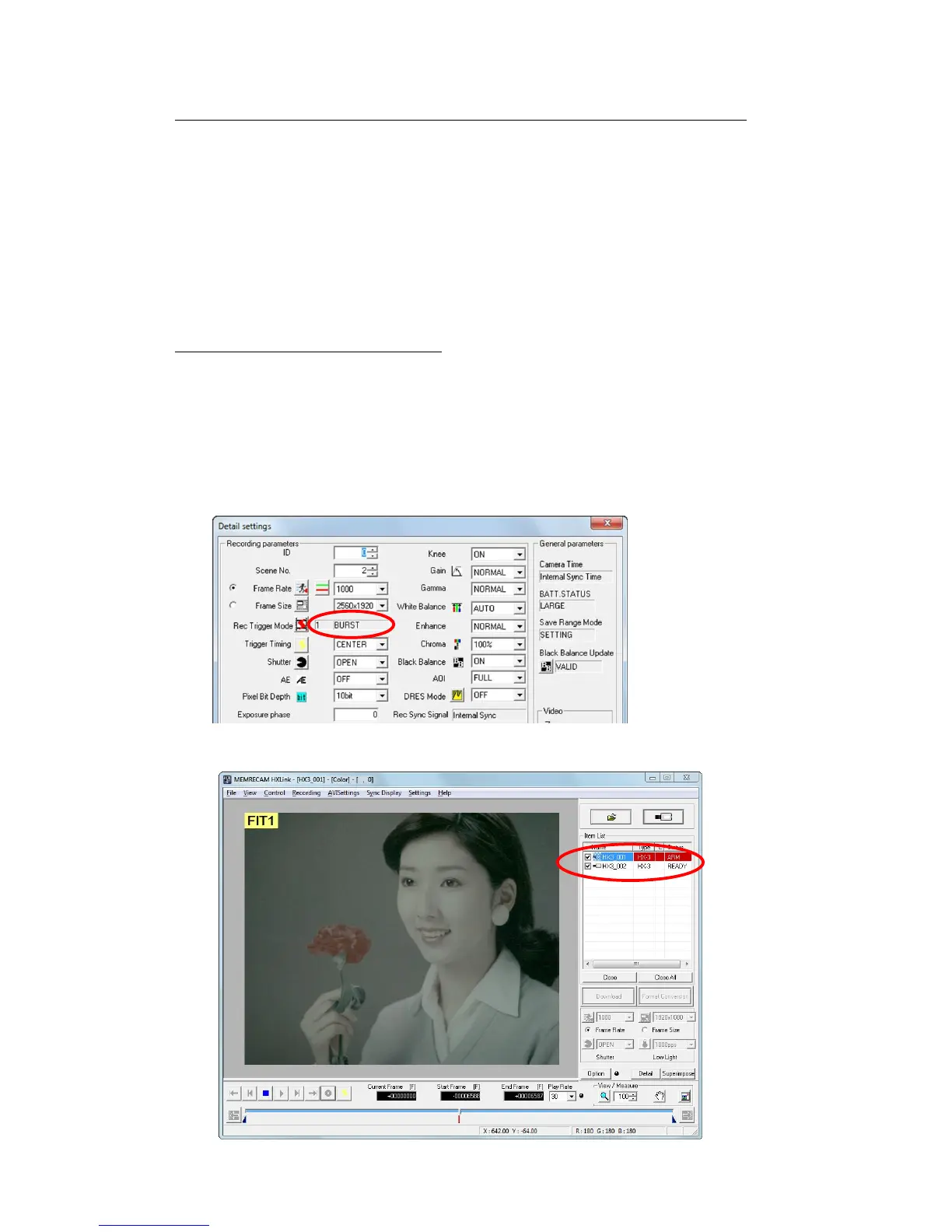If the recording trigger mode is “BURST”, image recording does not occur unless burst signals