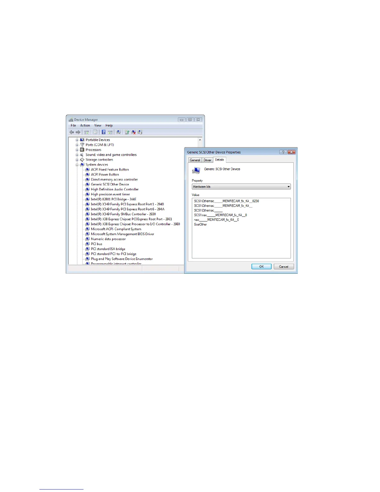 Open "Property" in "Generic SCSI Other Device" and select "Details". Select "Hardware IDs" in