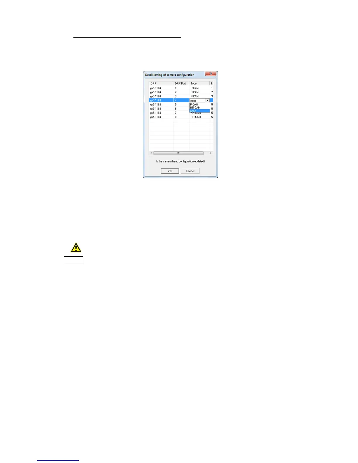 Configuration" dialogue. Select the camera head type connected to the DRP in the "Type" column.