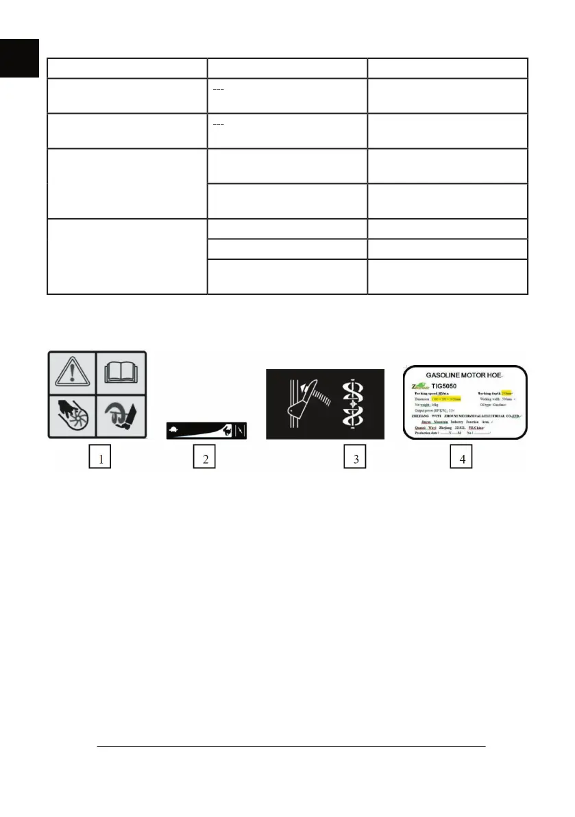 1: Sikkerhedssymboler 2: Indstillingssymboler 3: Symbol for koblingsgreb 4. Typeskilt