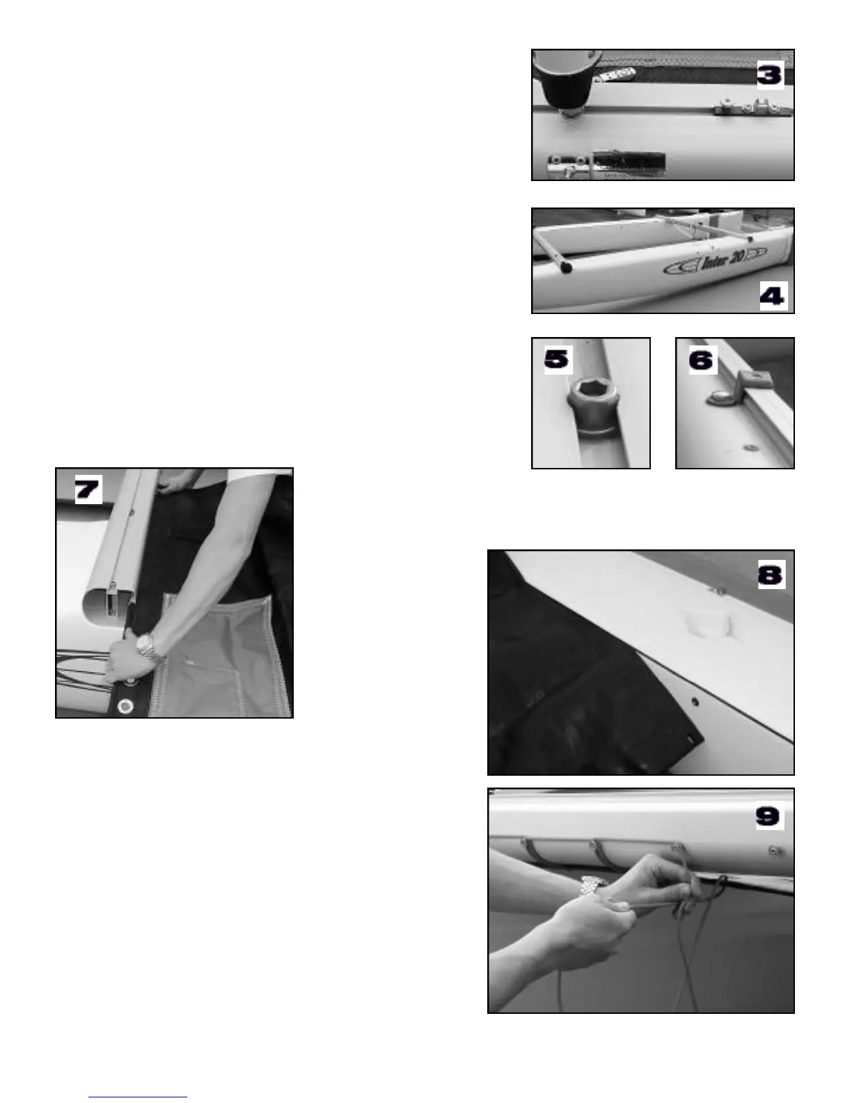 N ext, slide each side of the trampoline into the hull tra cks (8). Pull