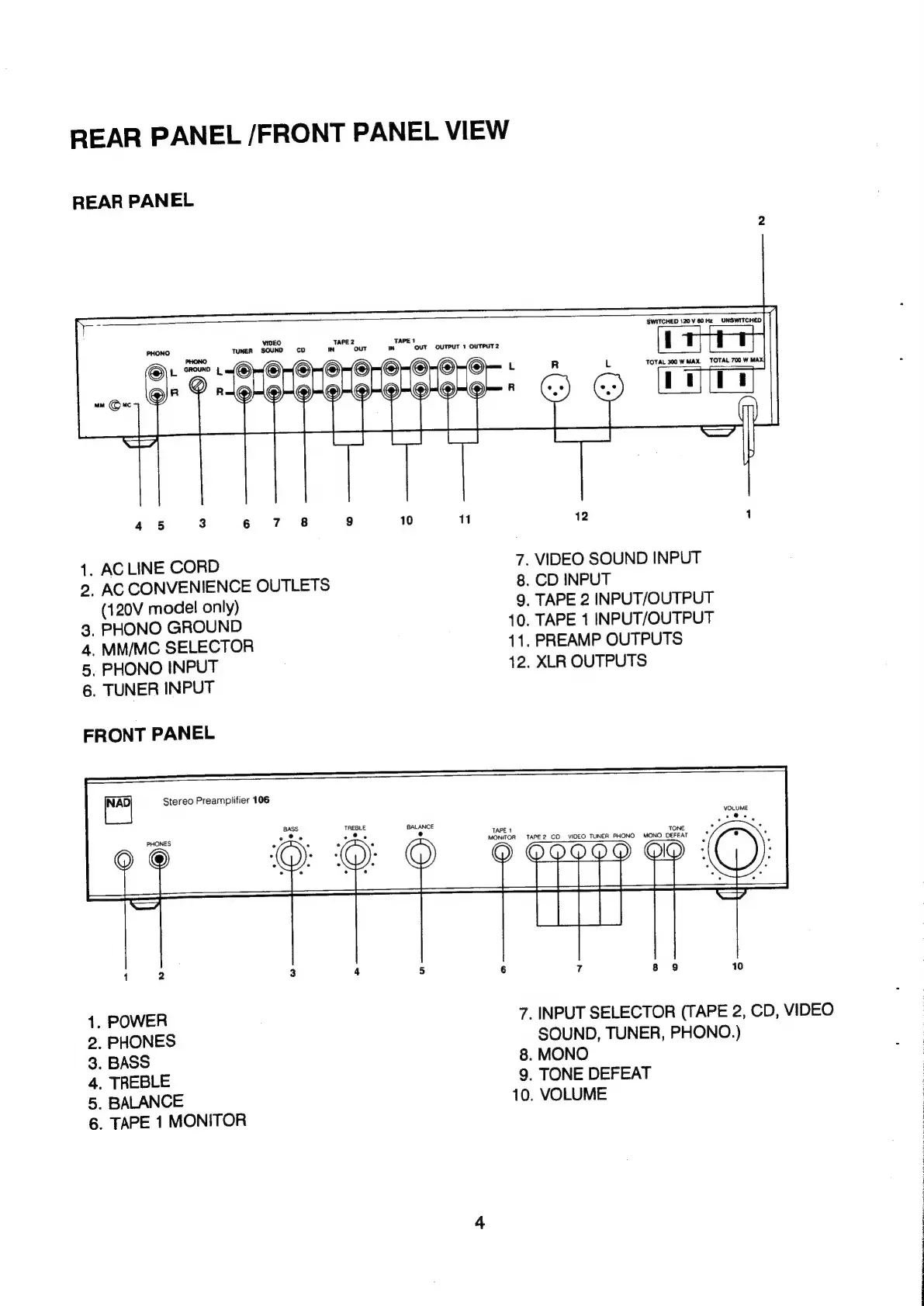 NAD 106 - Panel Views; Rear Panel Identification; Front Panel Identification