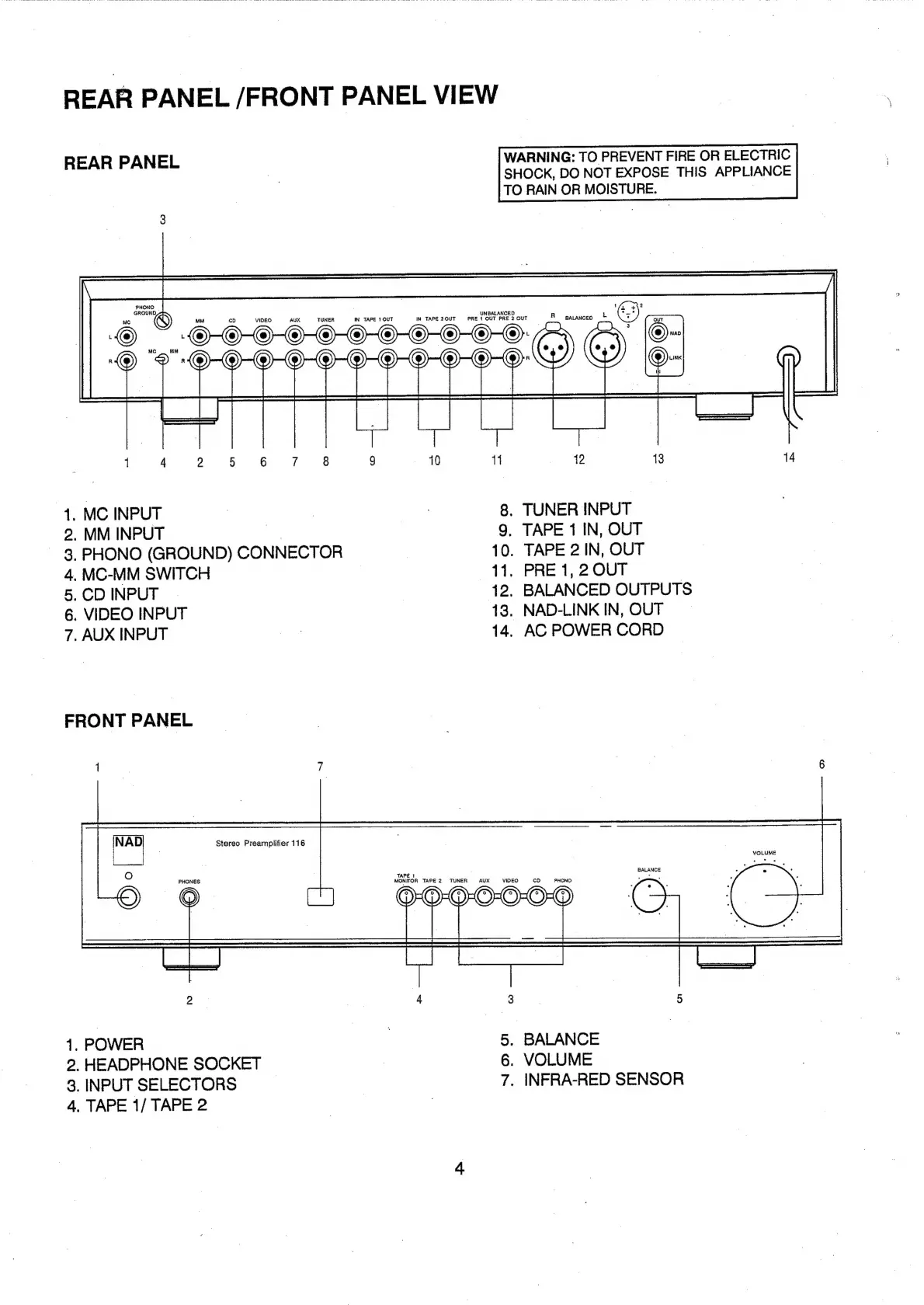 NAD 116 - Panel Views; Rear Panel Identification; Front Panel Identification