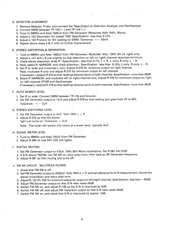 NAD 1700 - FM Alignment Procedures - Part 2; Detector Alignment; Stereo Separation and Distortion; Auto Search and Switching Levels