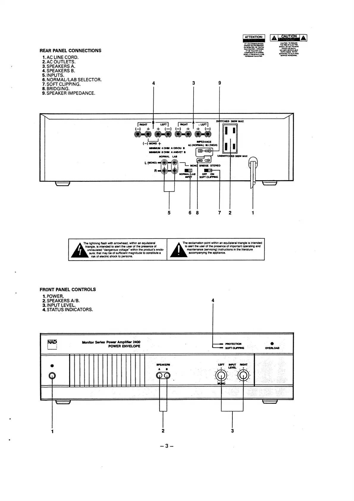 NAD 2400 - NAD 2400 Rear Panel Connection Guide; Rear Panel Connector Descriptions; NAD 2400 Front Panel Control Overview; Front Panel Control and Indicator Functions