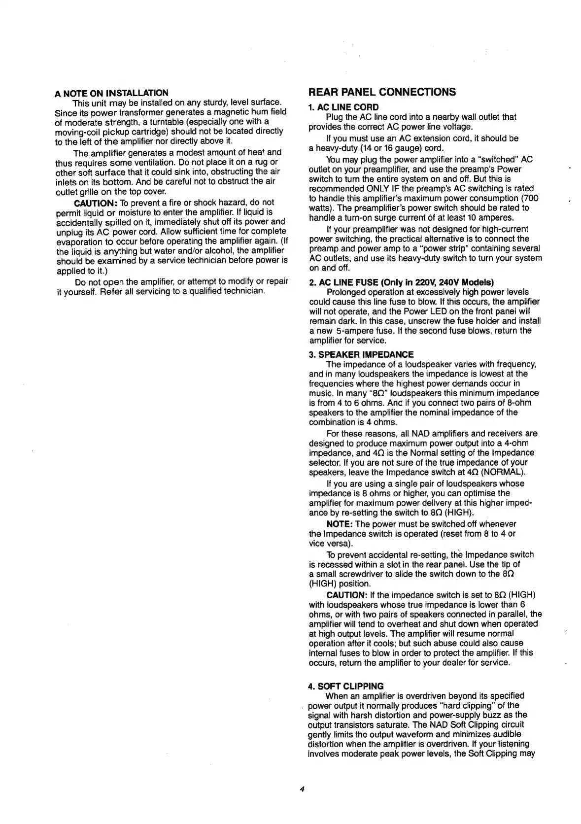NAD 2600 - REAR PANEL CONNECTIONS; AC LINE CORD; AC LINE FUSE; SPEAKER IMPEDANCE