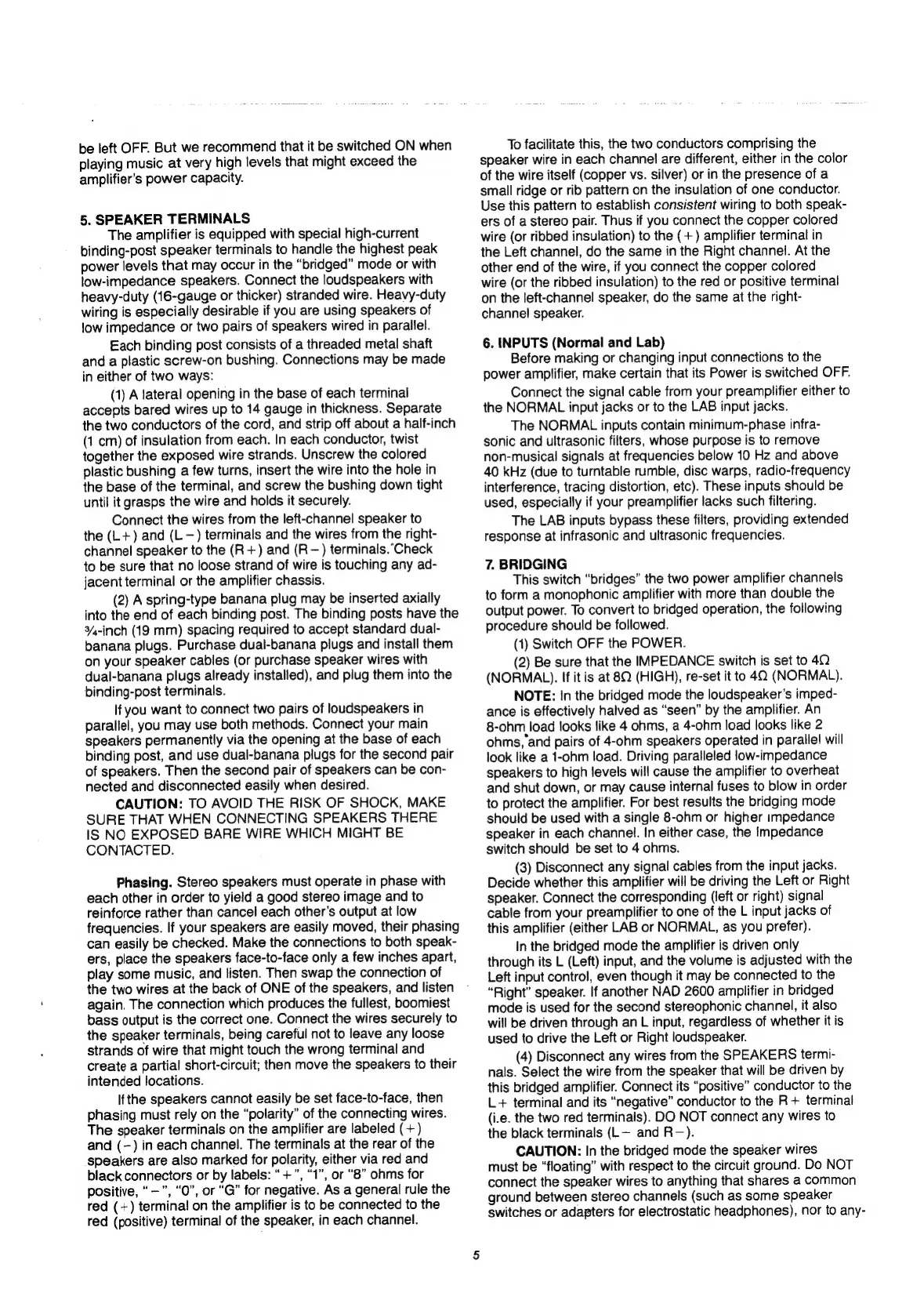NAD 2600 - SPEAKER TERMINALS AND CONNECTIONS; SPEAKER TERMINALS; Phasing; INPUTS AND BRIDGING
