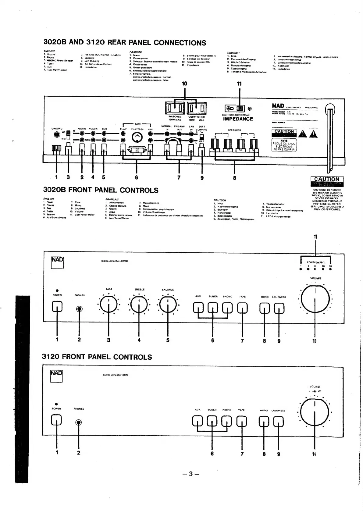 NAD 3120 - Panel Layout and Controls; Rear Panel Connections; Front Panel Controls (3020 B & 3120)
