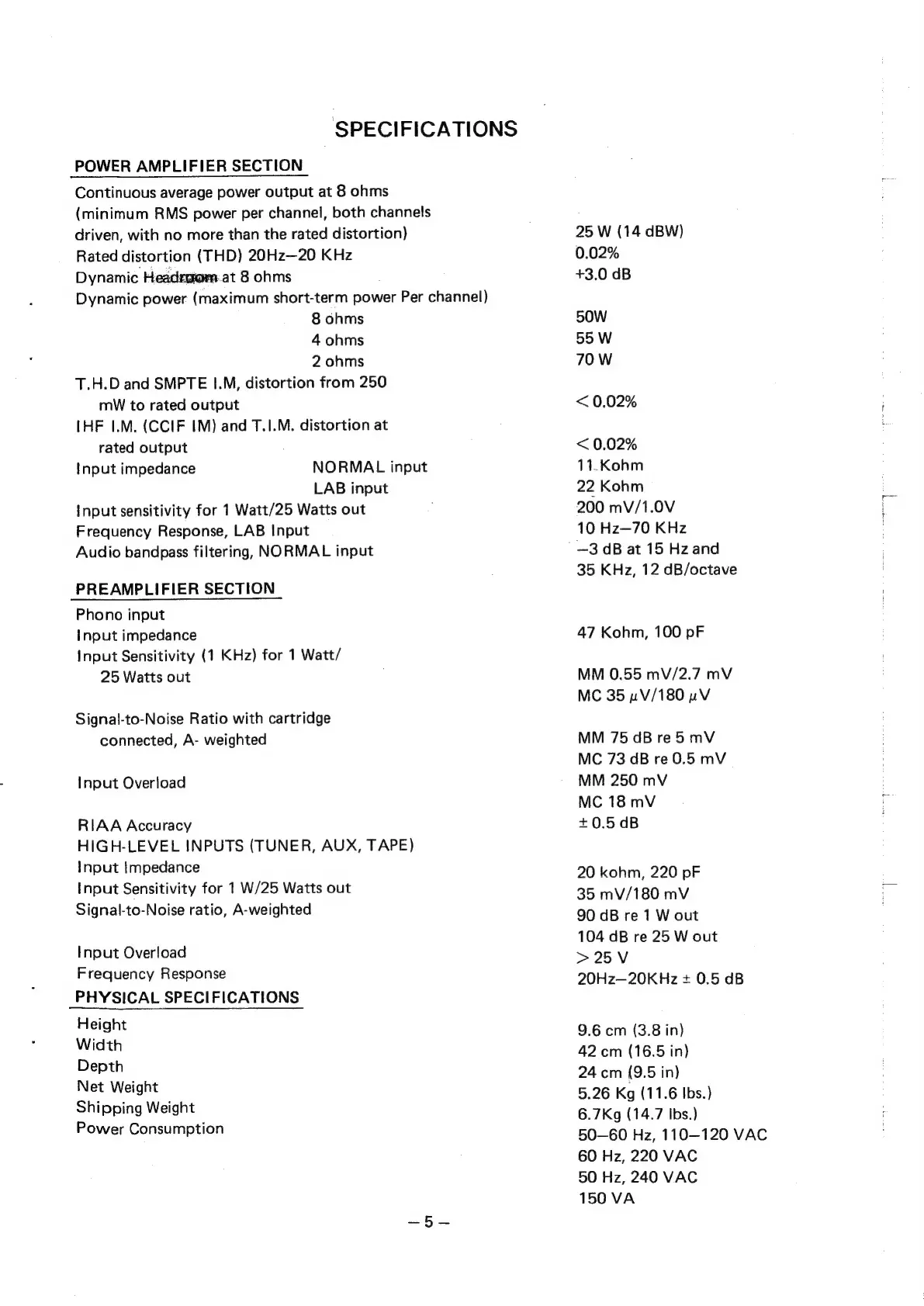 NAD 3120 - Specifications; Power Amplifier Section; Preamplifier Section; Physical Specifications