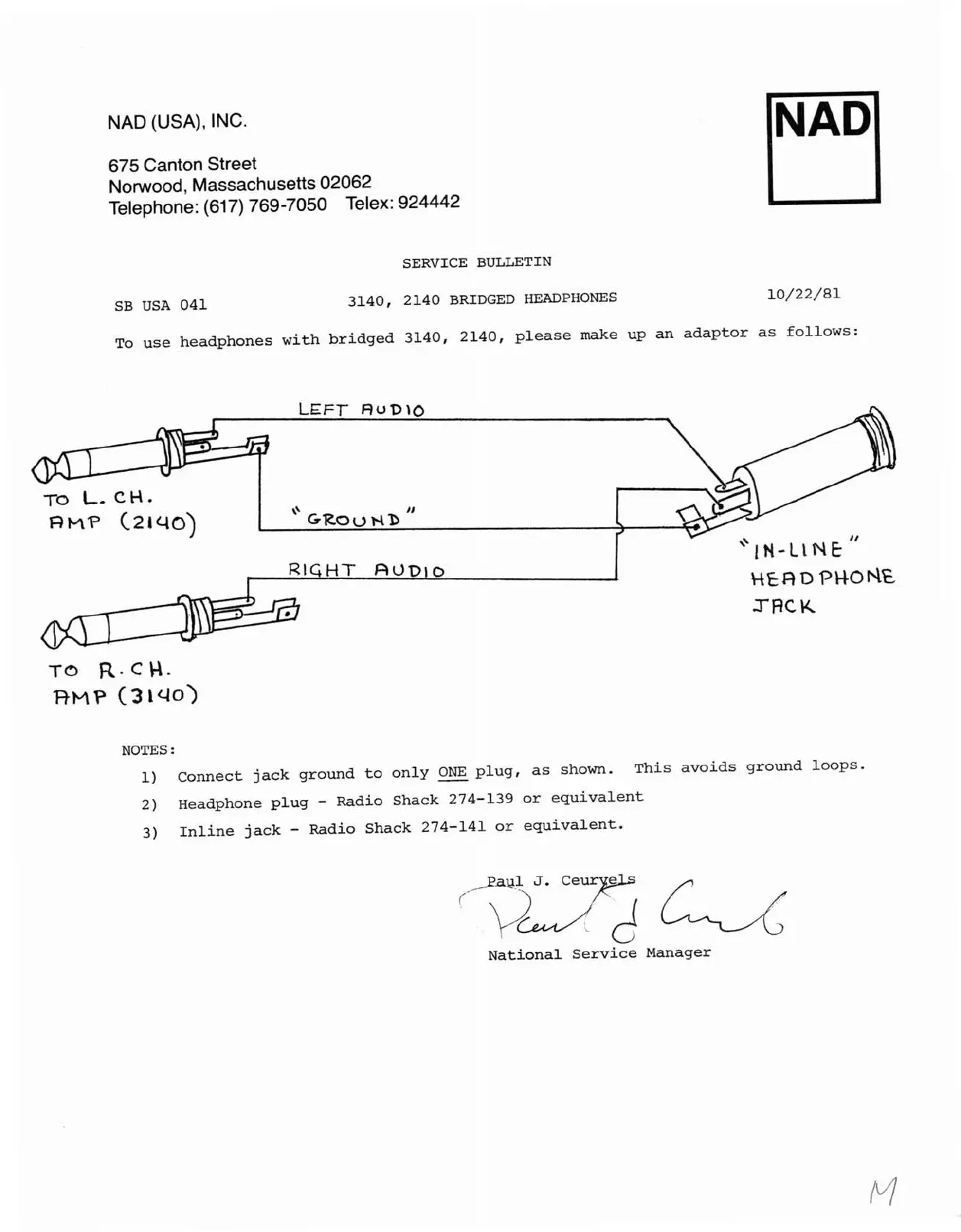 NAD 3140 - Service Bulletin: Bridged Headphones Adapter