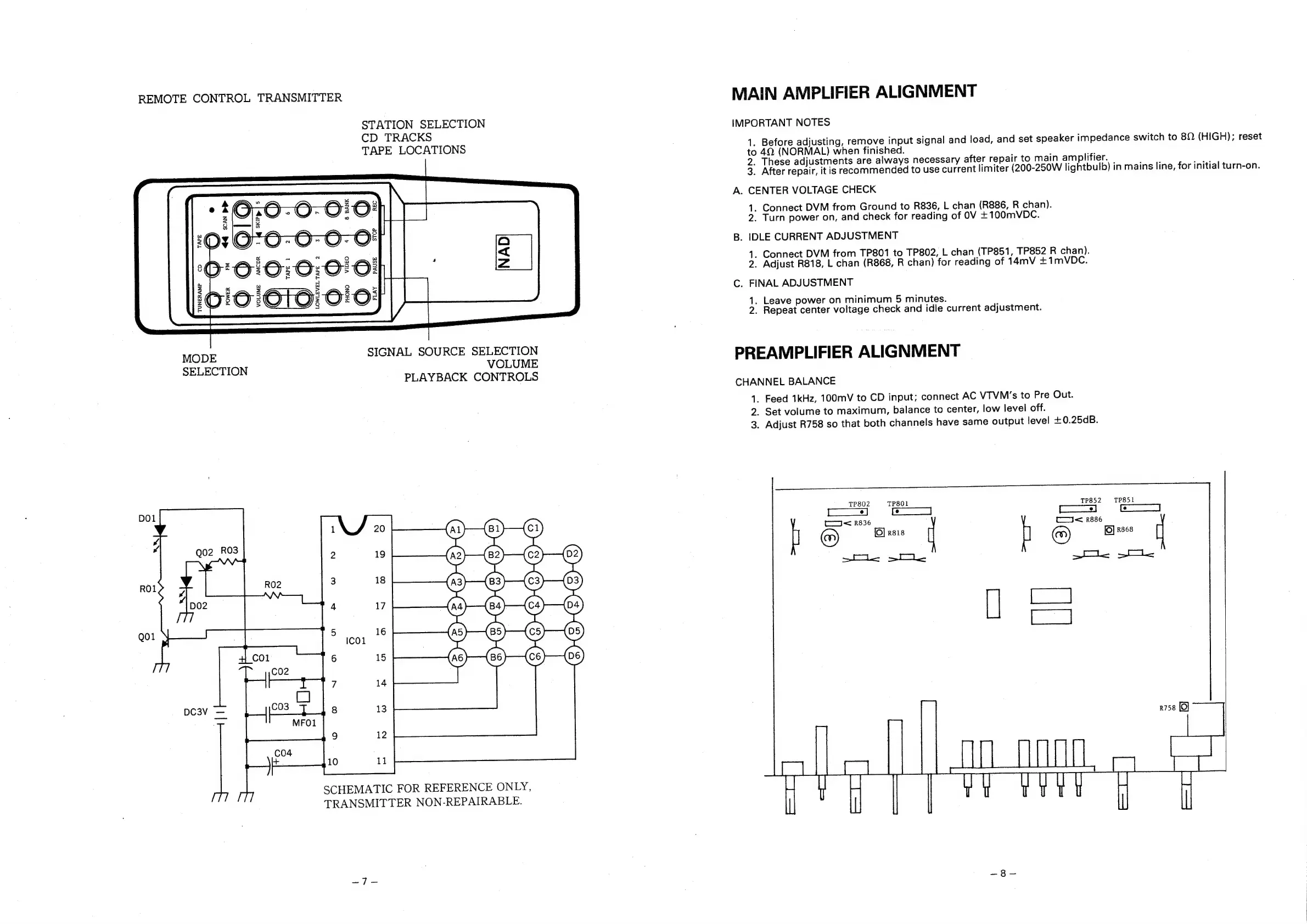 NAD 3400 - Remote Control Transmitter; Main Amplifier Alignment; Main Amplifier Adjustment Procedures; Preamplifier Alignment