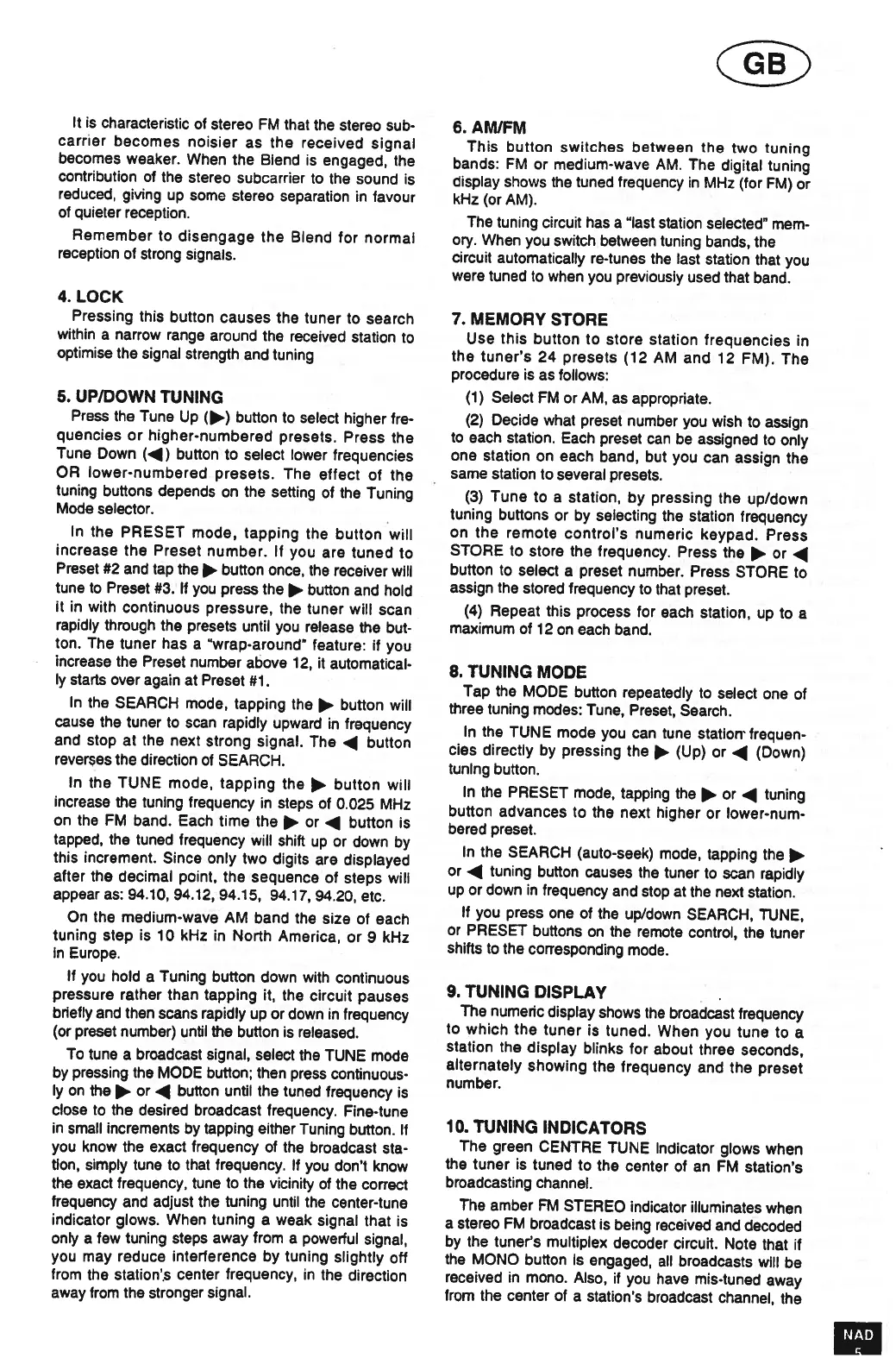NAD 412 - Front Panel Controls (Continued); Lock Button Function; Tuning Buttons Operation; AM;FM Band Switching