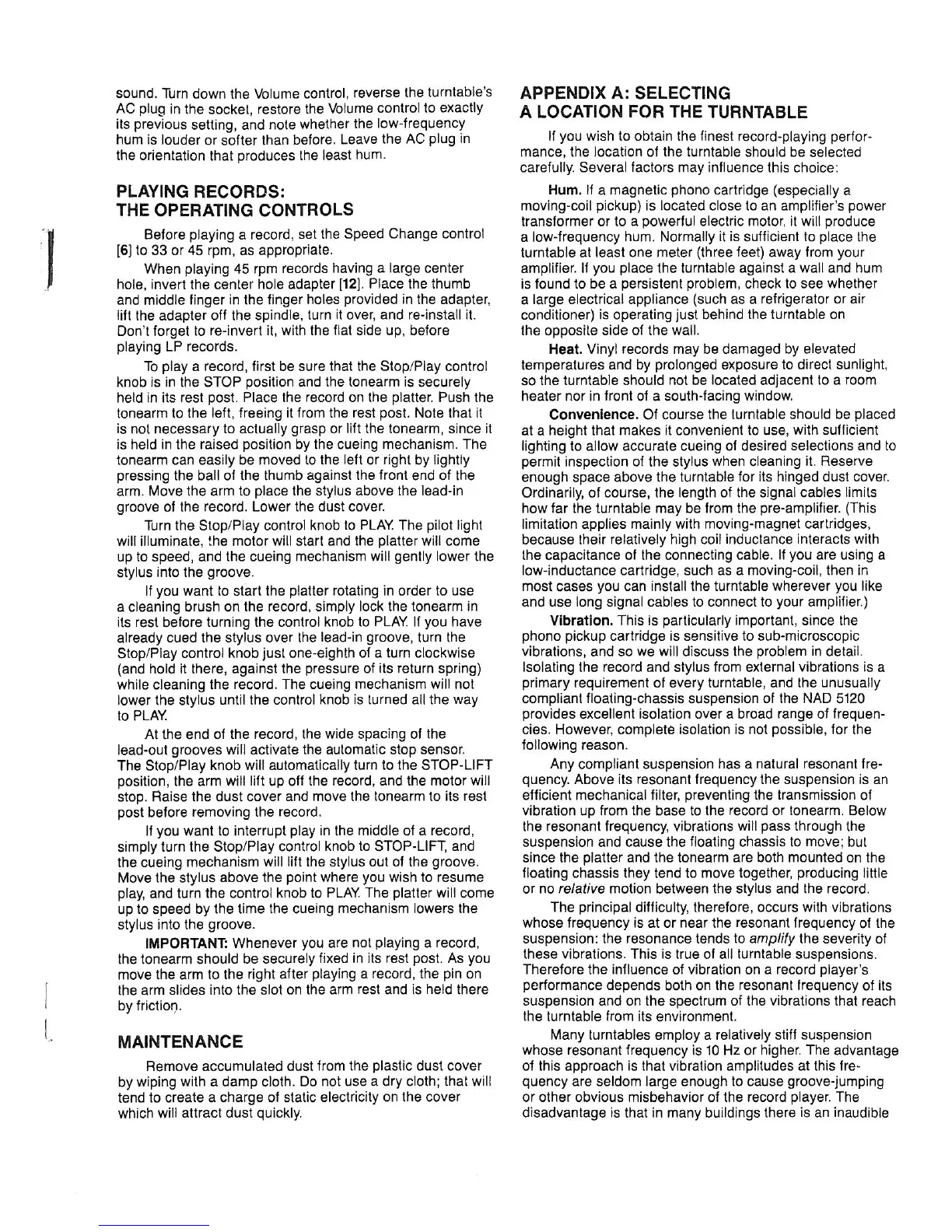 NAD 5120 - Playing Records: The Operating Controls; Maintenance and Location; Maintenance; Appendix A: Selecting a Location for the Turntable