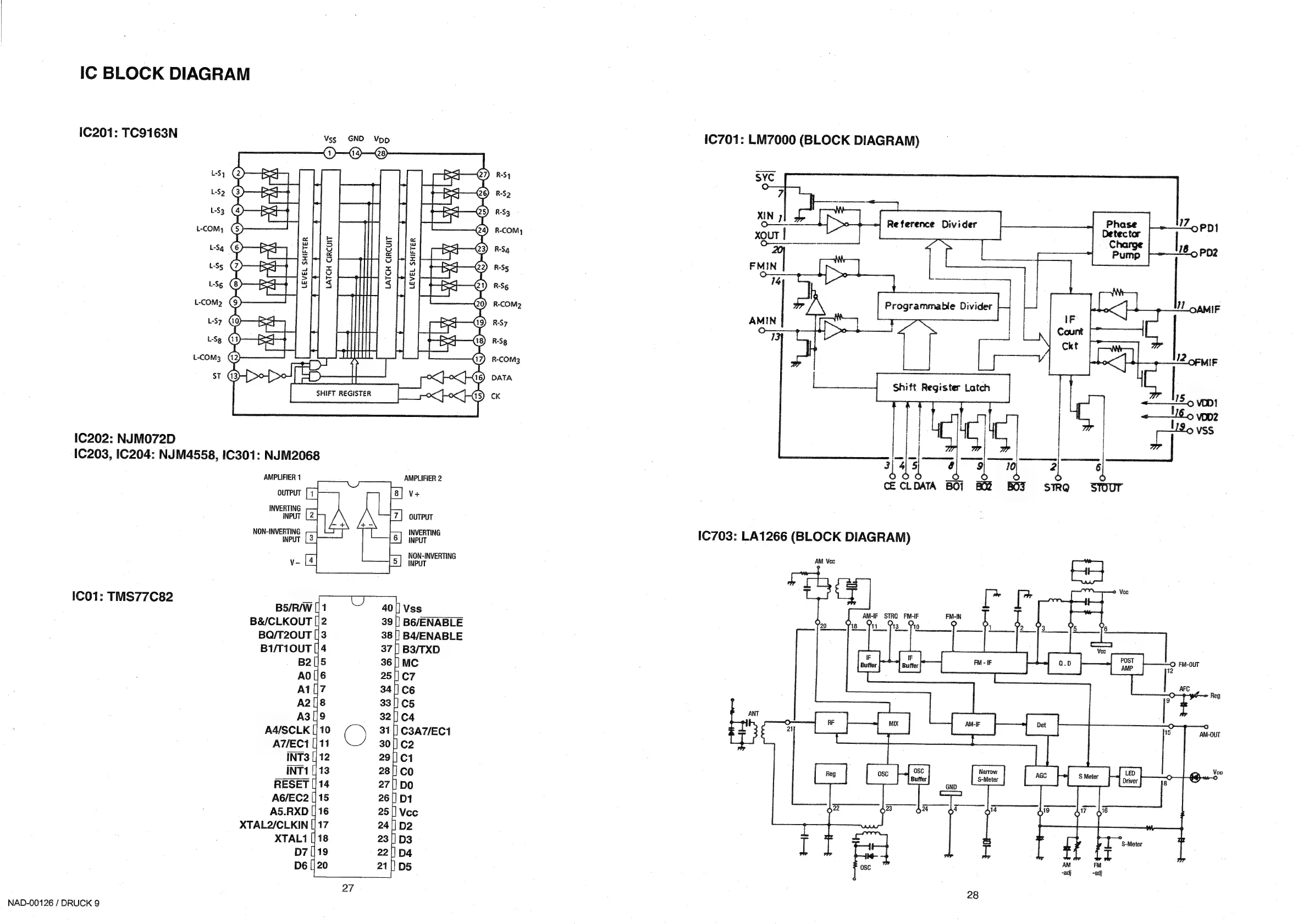 NAD 712 - Integrated Circuit Block Diagrams; TC9163 N, NJM072 D, NJM2068 Diagrams; LM7000 and LA1266 Block Diagrams; TMS77 C82 Microcontroller Block Diagram