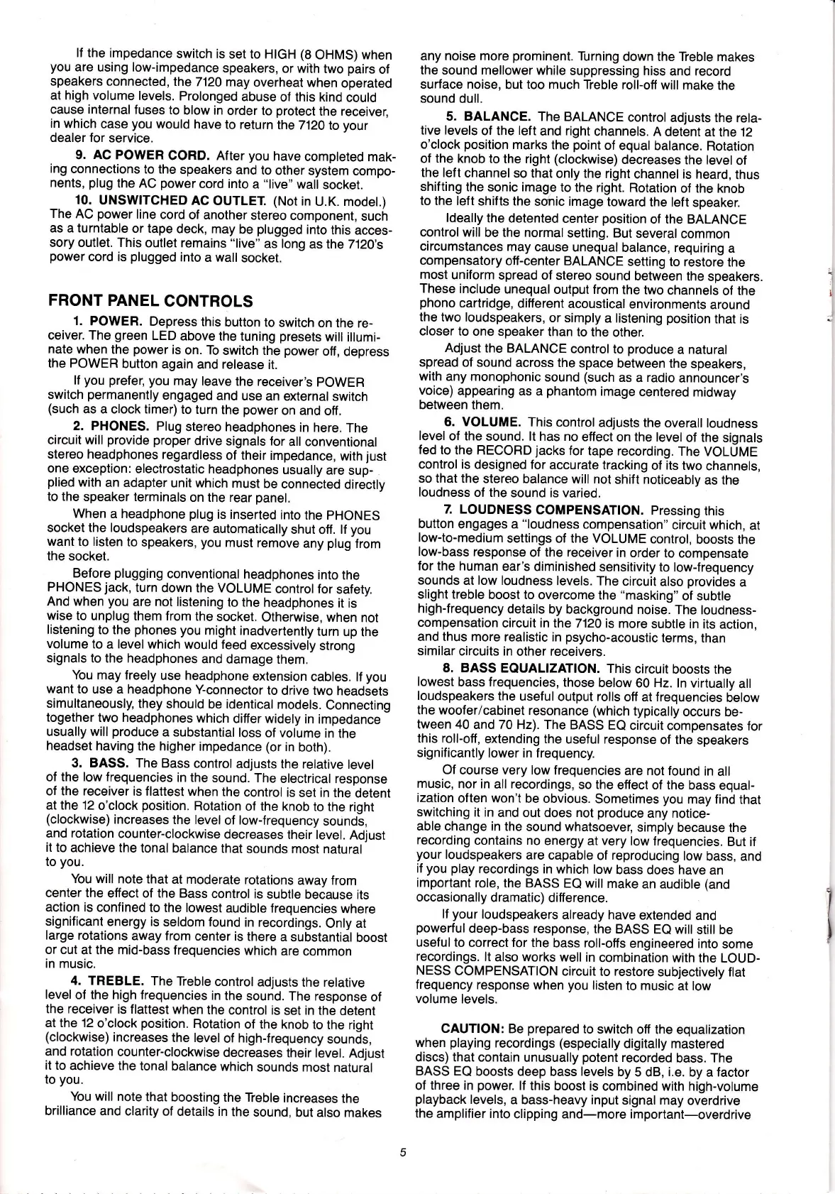 NAD 7120 - AC Power and Convenience Outlet; Front Panel Controls and Features; Power and Headphone Operations; Tone and Balance Adjustments