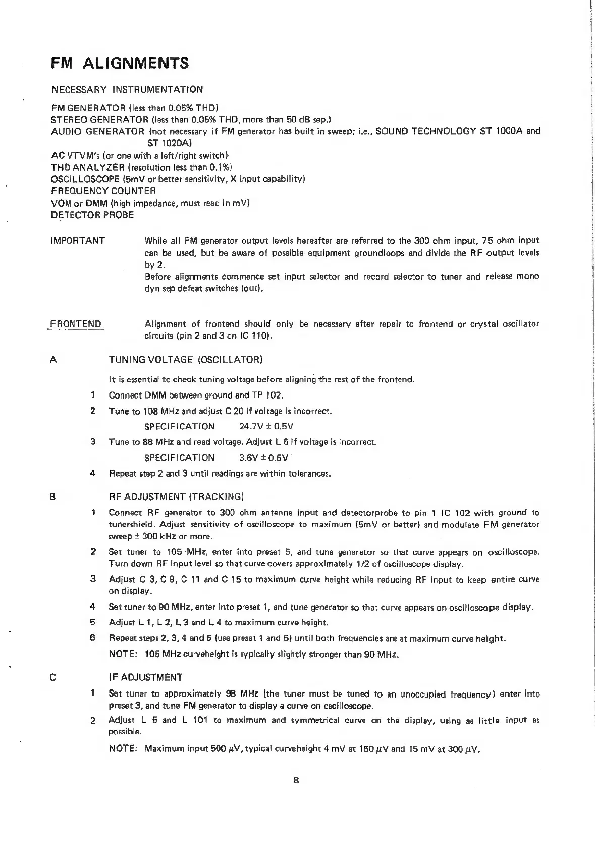 NAD 7155 - FM Alignments; Tuning Voltage (Oscillator); RF Adjustment (Tracking); IF Adjustment