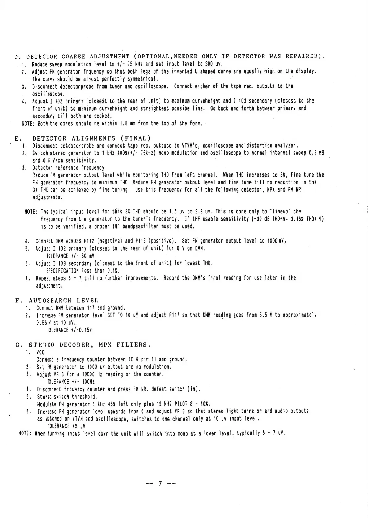 NAD 7220PE - FM Alignment: Detector and Stereo Decoder; Detector Coarse and Final Adjustments; Autosearch Level and Stereo Decoder Setup