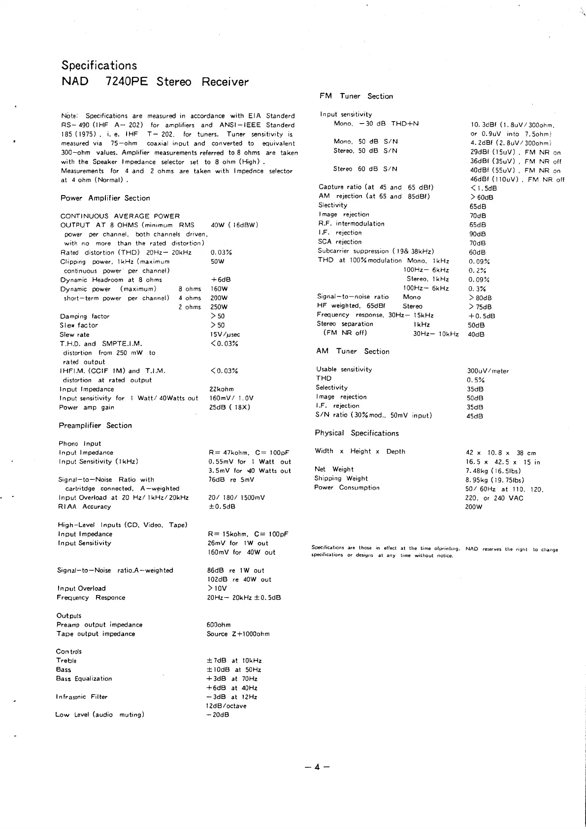 NAD 7240 - Receiver Specifications; Power Amplifier Performance; Tuner Performance Specifications