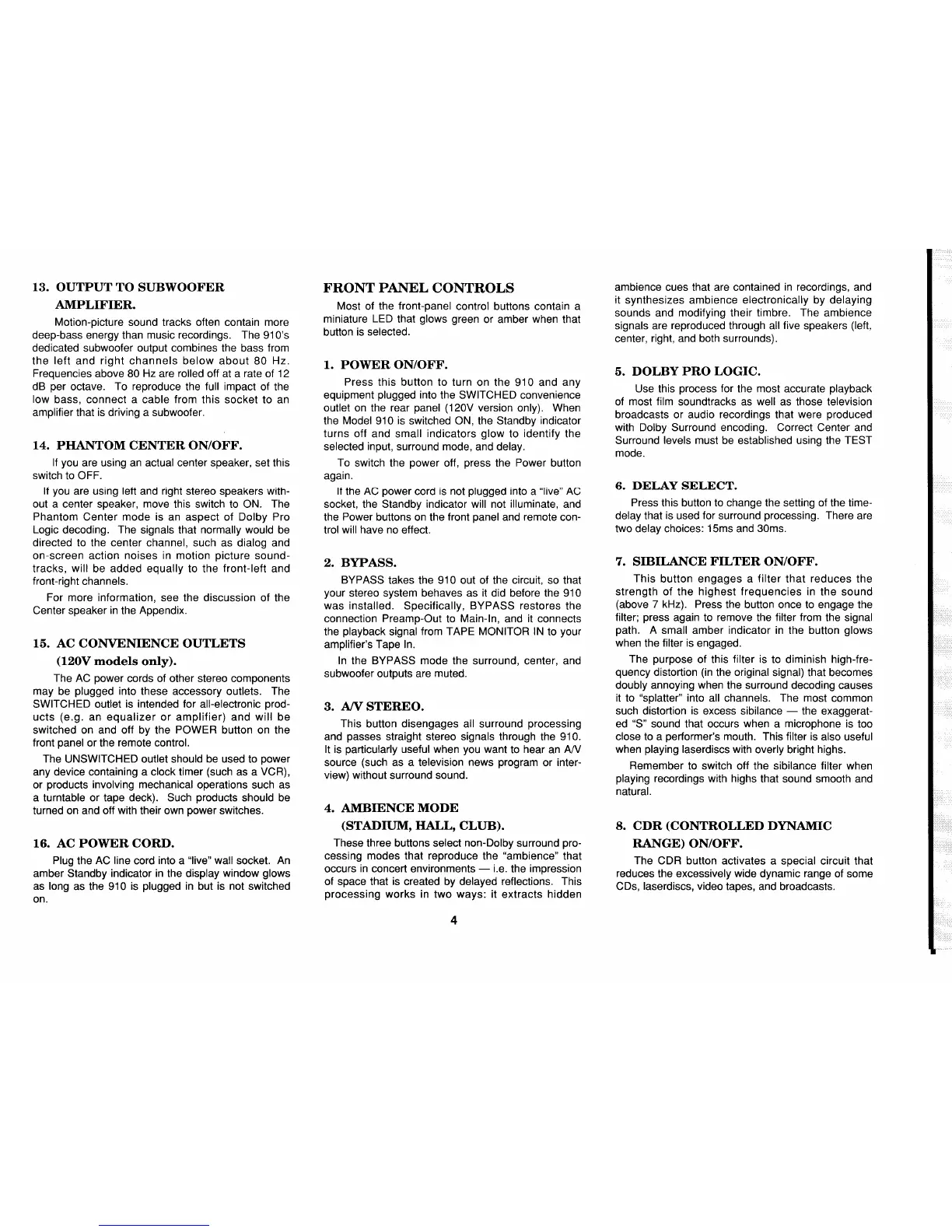 NAD 910 - Output to Subwoofer Amplifier; Phantom Center On;Off; AC Convenience Outlets; AC Power Cord