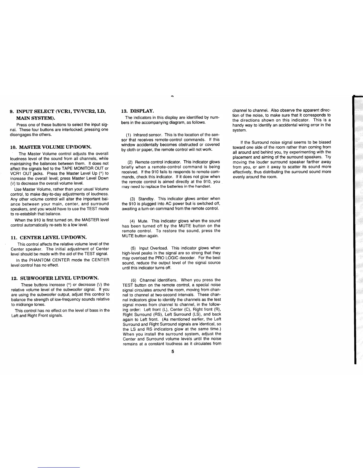 NAD 910 - Input Select (VCR1, TV;VCR2, LD, Main System); Master Volume Up;Down; Center Level Up;Down; Subwoofer Level Up;Down