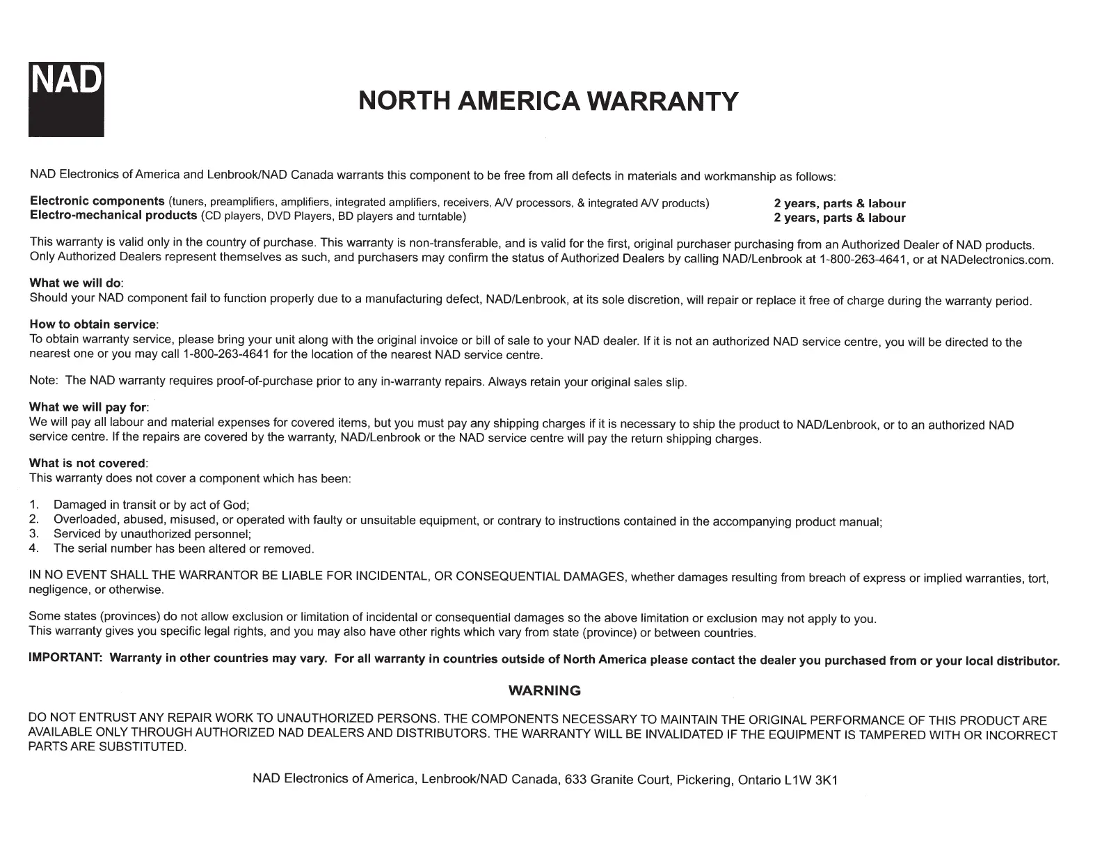 America and Lenbrook/NAD Canada warrants this component to be free from