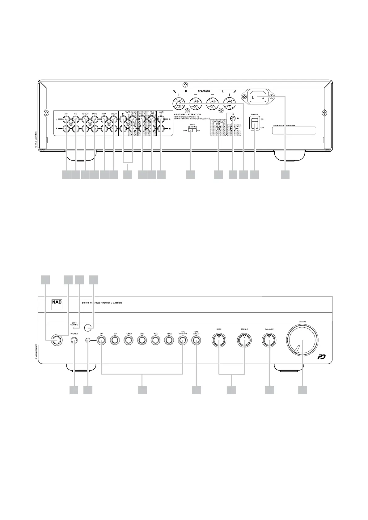 NAD C 326BEE - REAR PANEL; FRONT PANEL VIEW