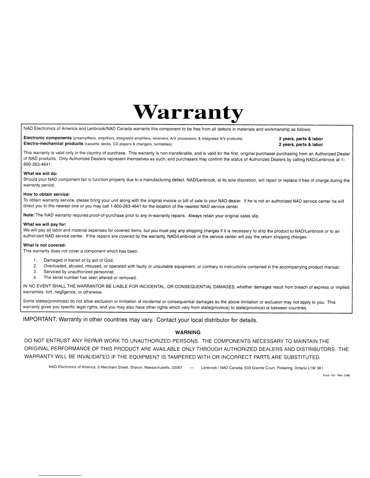 America and Lenbrook/NAD Canada warrants this component to