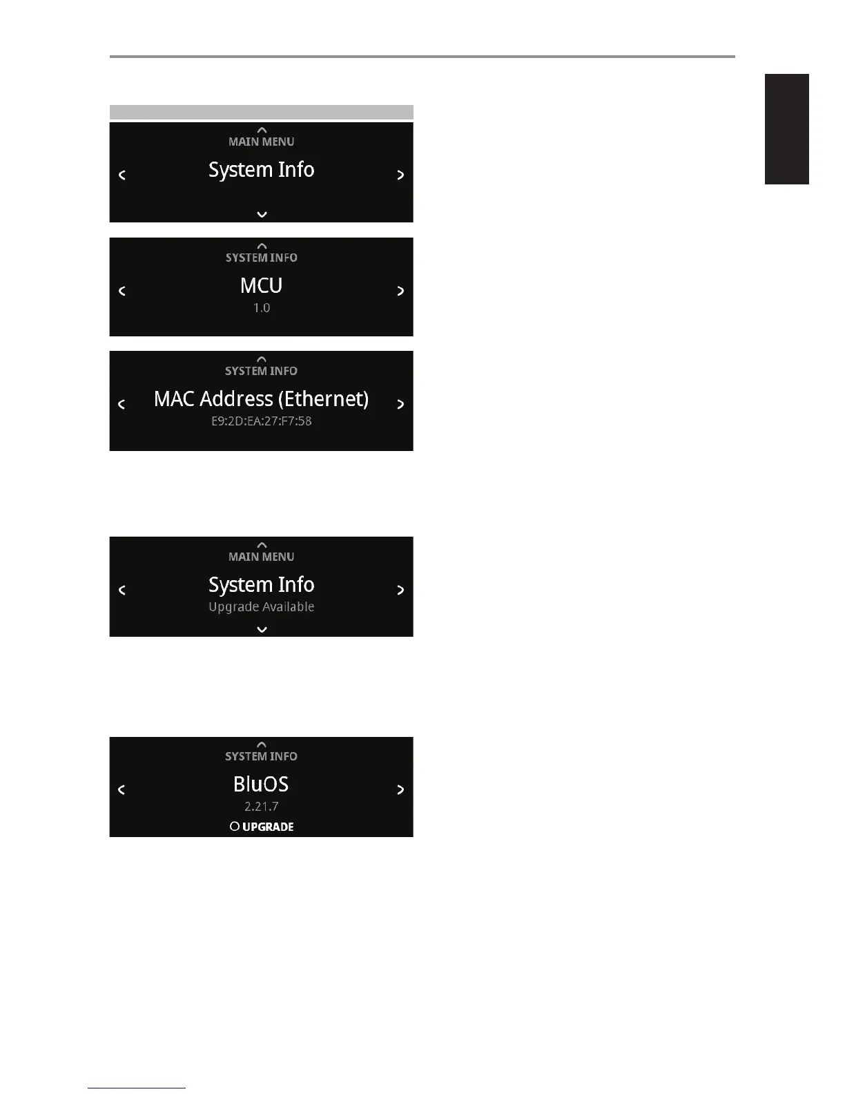 “System Info” displays information about current MCU, LCD and BluOS