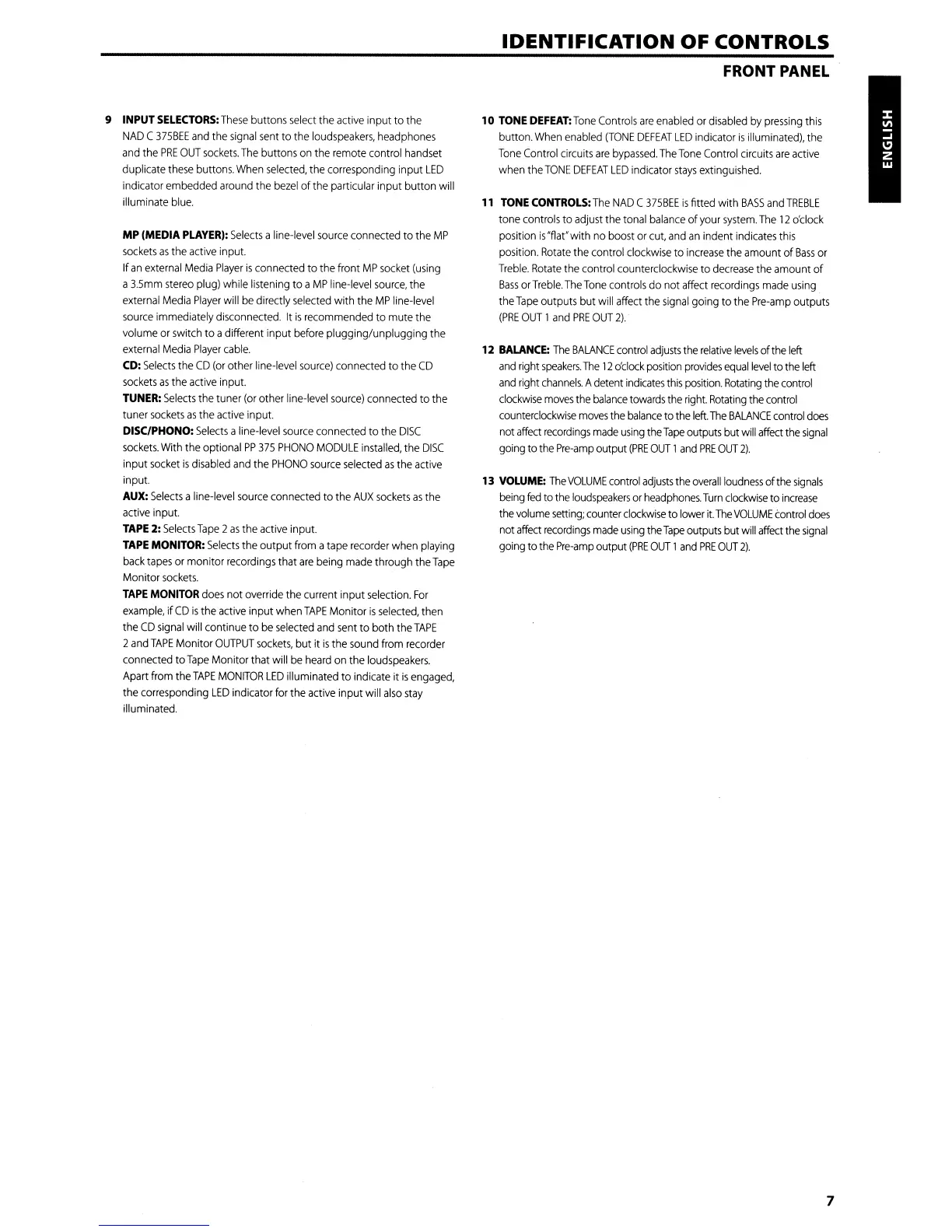NAD C375BEE - Input Selectors; Tone Defeat; Tone Controls; Balance Control