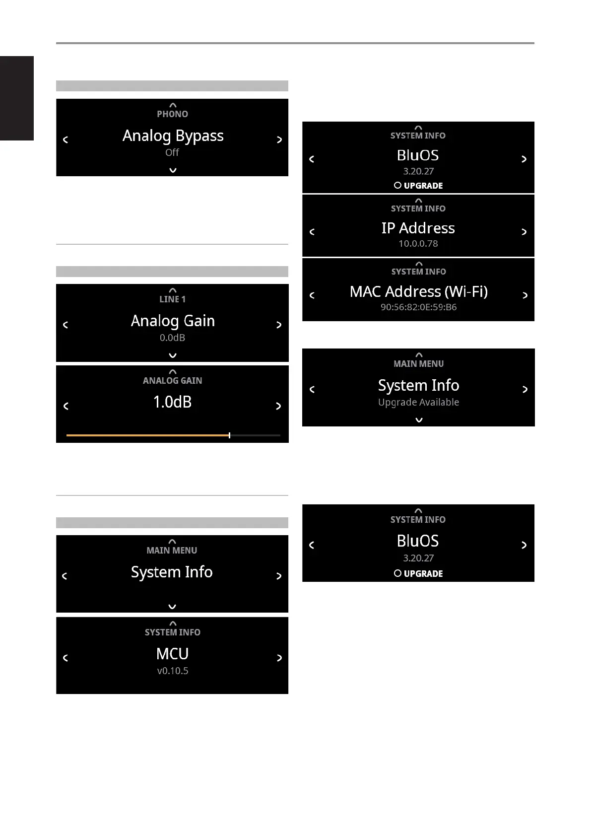 If “Upgrade Available” is shown, use [f] to go to BluOS upgrade menu.