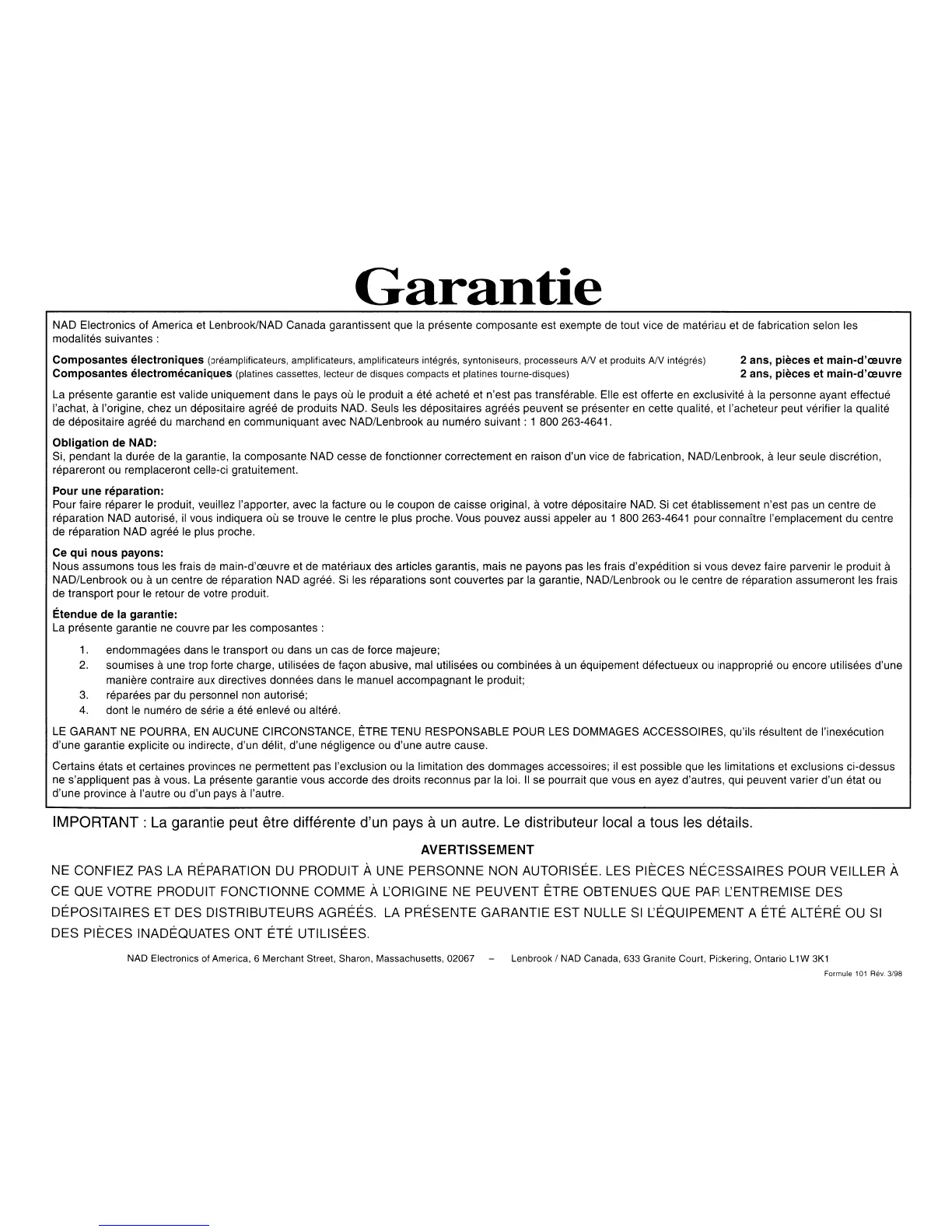 la garantie, la composante. NAD cesse de fonctionner correctement