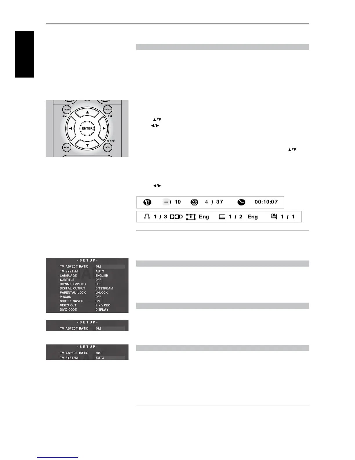 • The front panel and HTR 4’s “DISP” button toggles between time/track/chapters and subtitle/