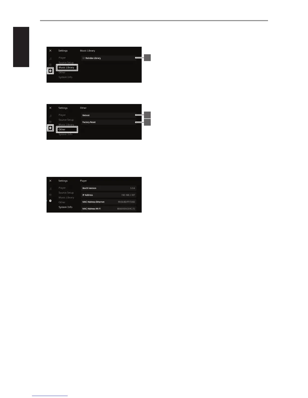 Display information about current BluOS rmware version, IP Address,