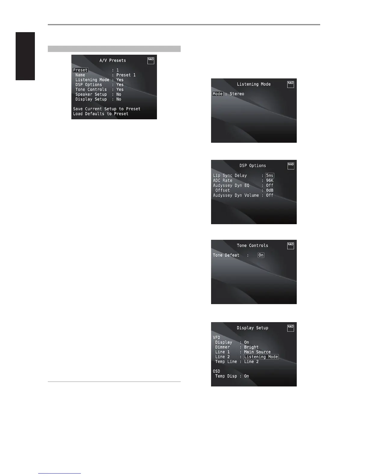 parameters set forth in “Listening Mode”, “DSP Options” and “Tone Controls”