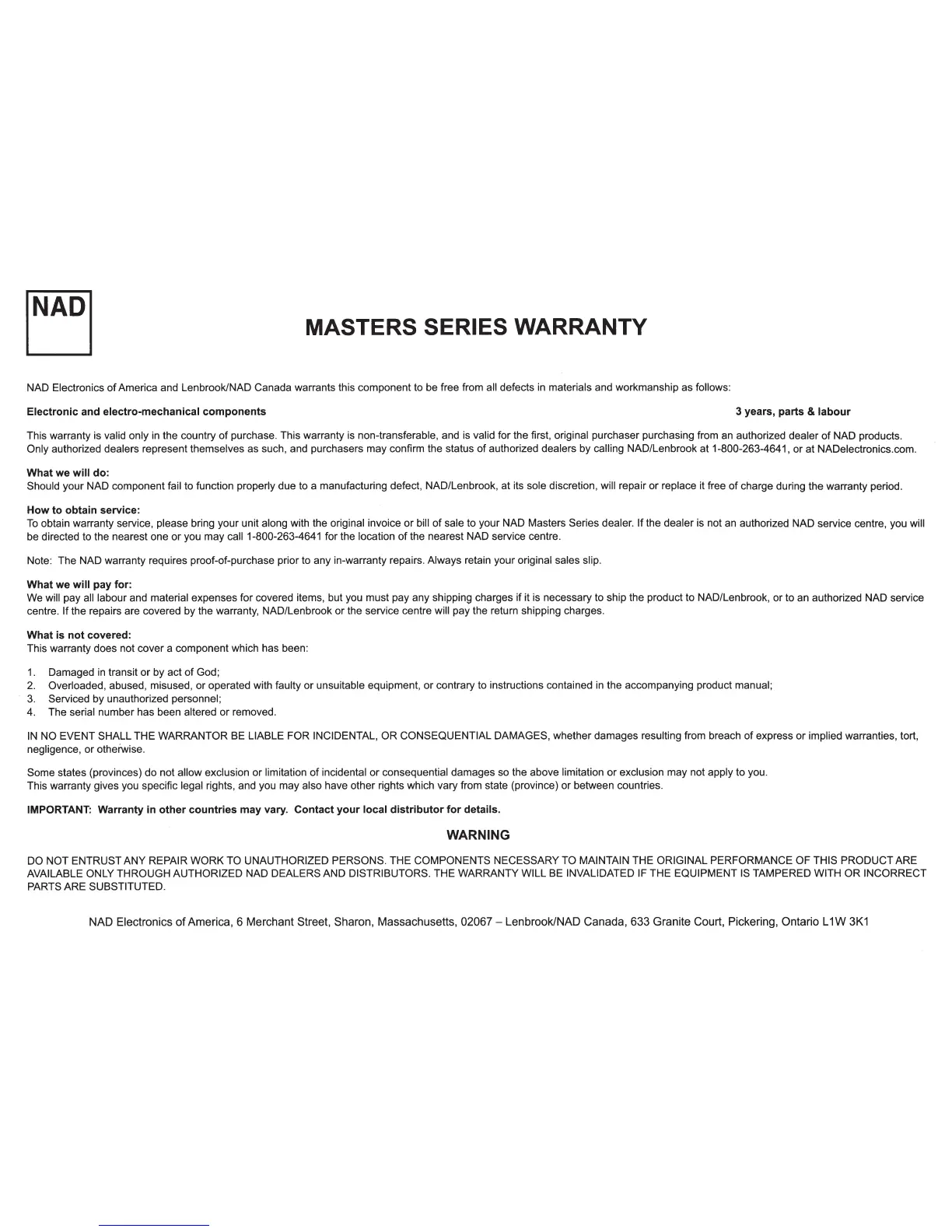 Should your NAD component fail to function properly due to a manufacturing defect, NAD/Lenbrook, at its sole discretion, will repair or replace it free