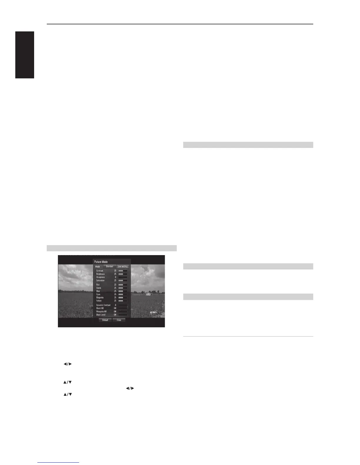6 Select “Default” to restore Picture Mode default settings. Select “Close” to