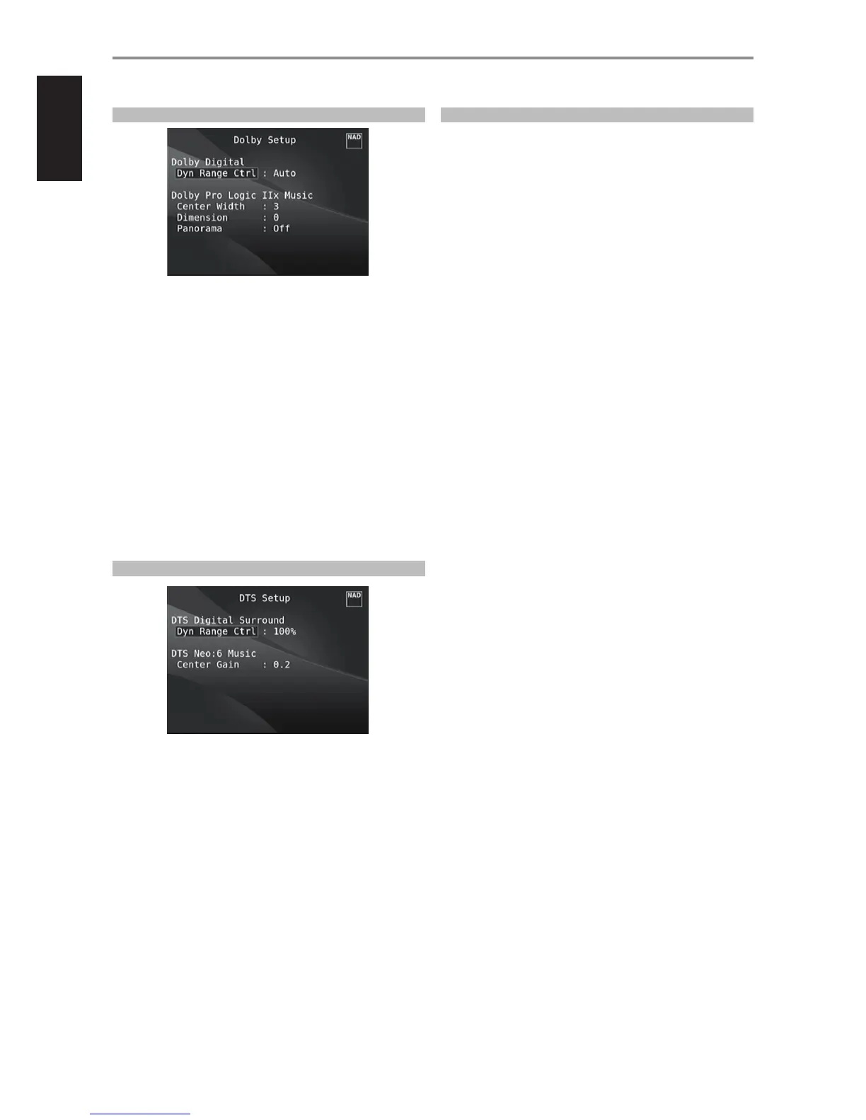 Under this menu, the Dolby Digital’s Dynamic Range Control can be