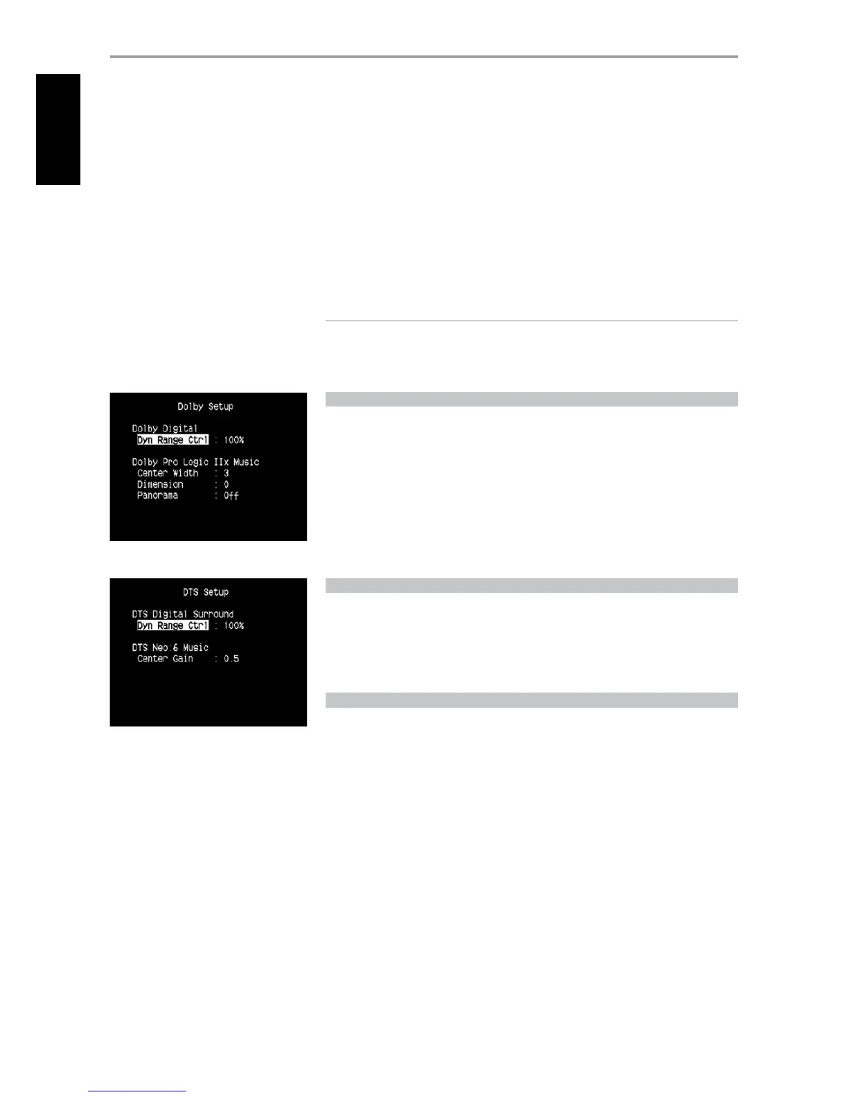 Under this menu, the Dolby Digital’s Dynamic Range Control can be adjusted as well as the settings for