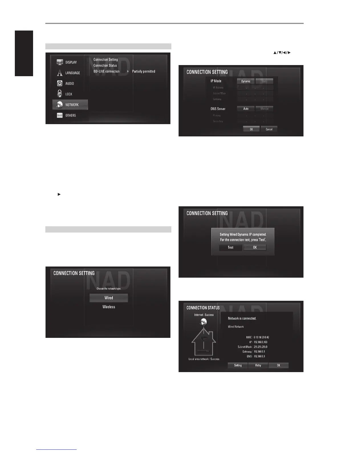 5 If “Test” is selected, the network connection status is displayed as in