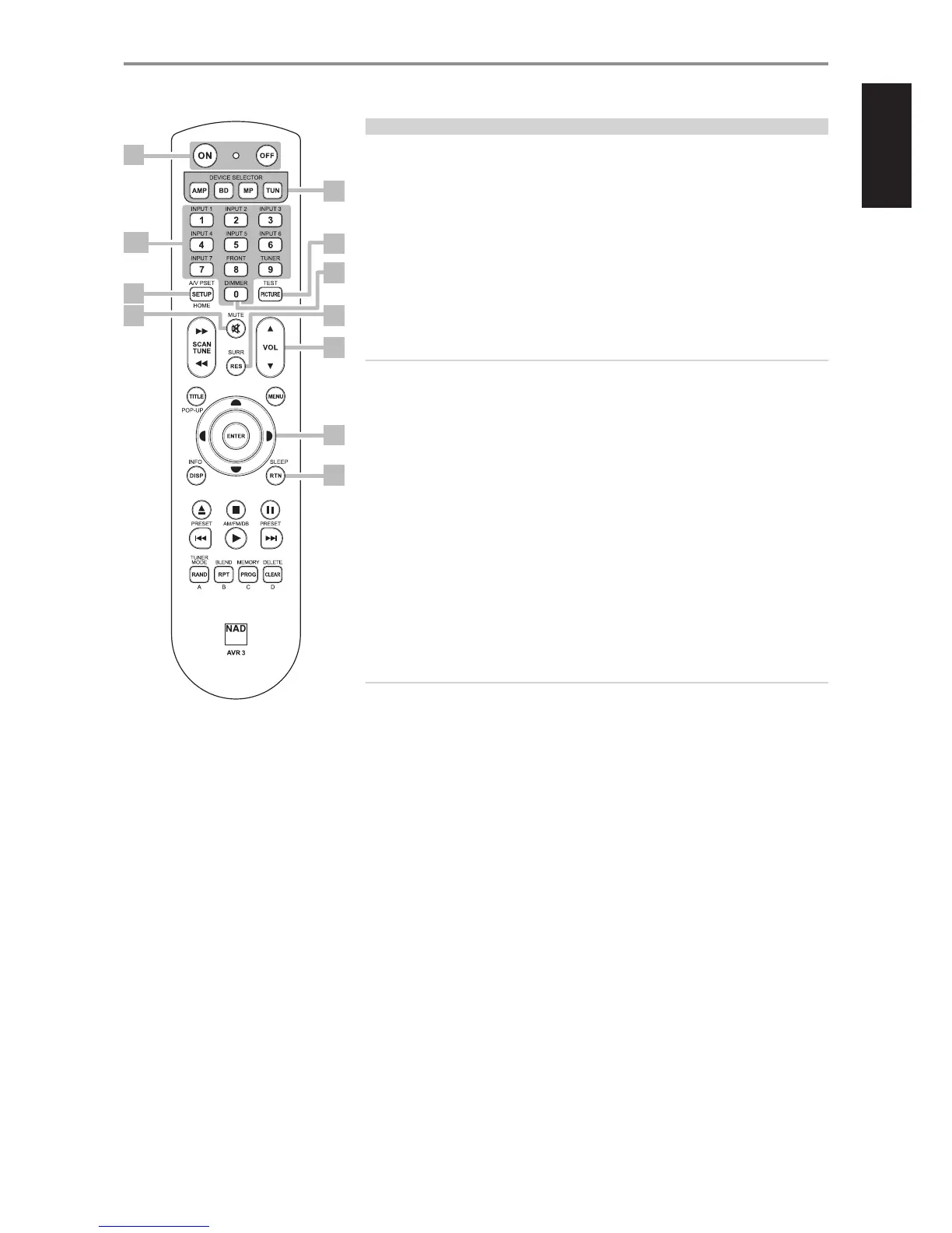 1 POWER ON & OFF: The AVR 3 remote has a separate ON and OFF button. Press the ON button