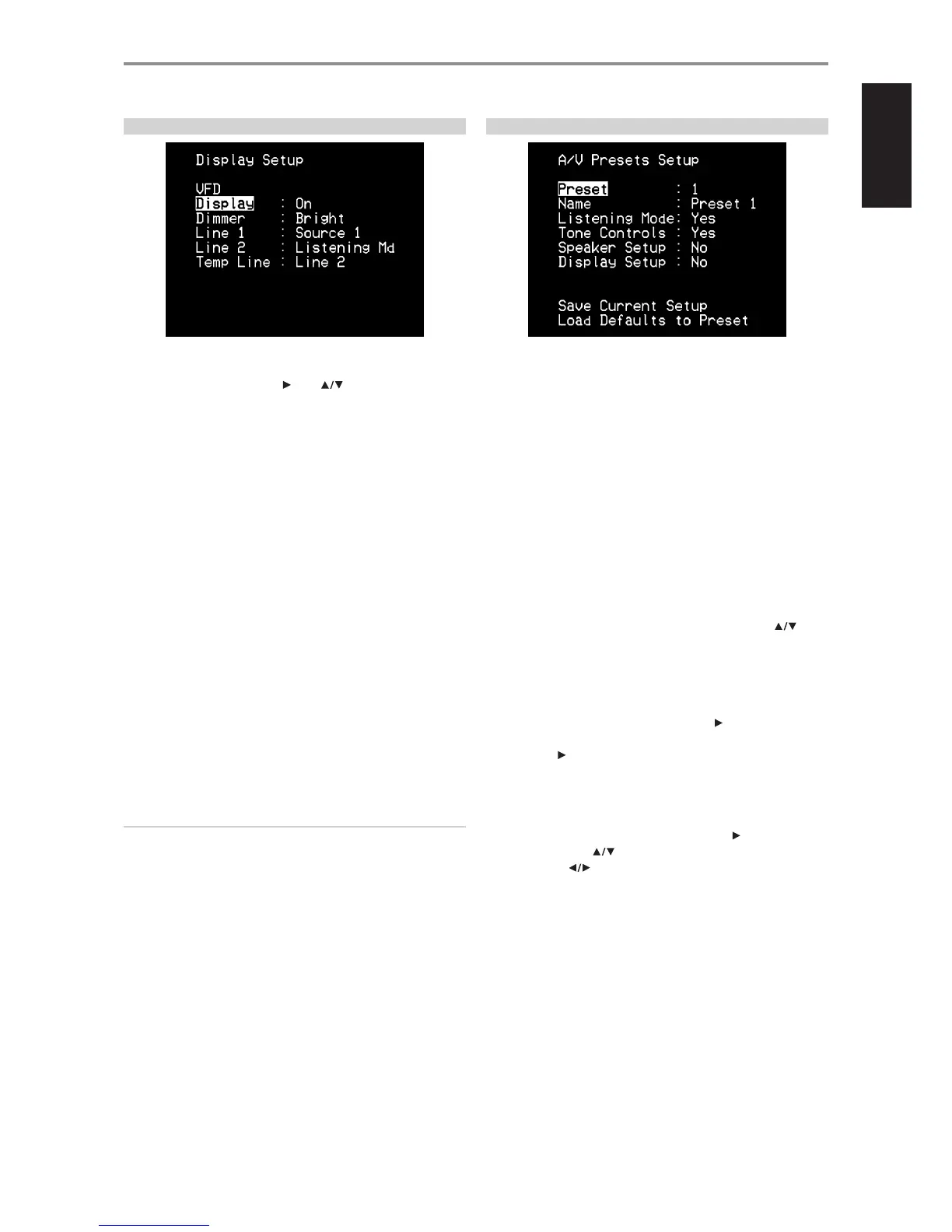 “Listening Mode”, “Tone Controls”, “Speaker Setup” and “Display Setup”