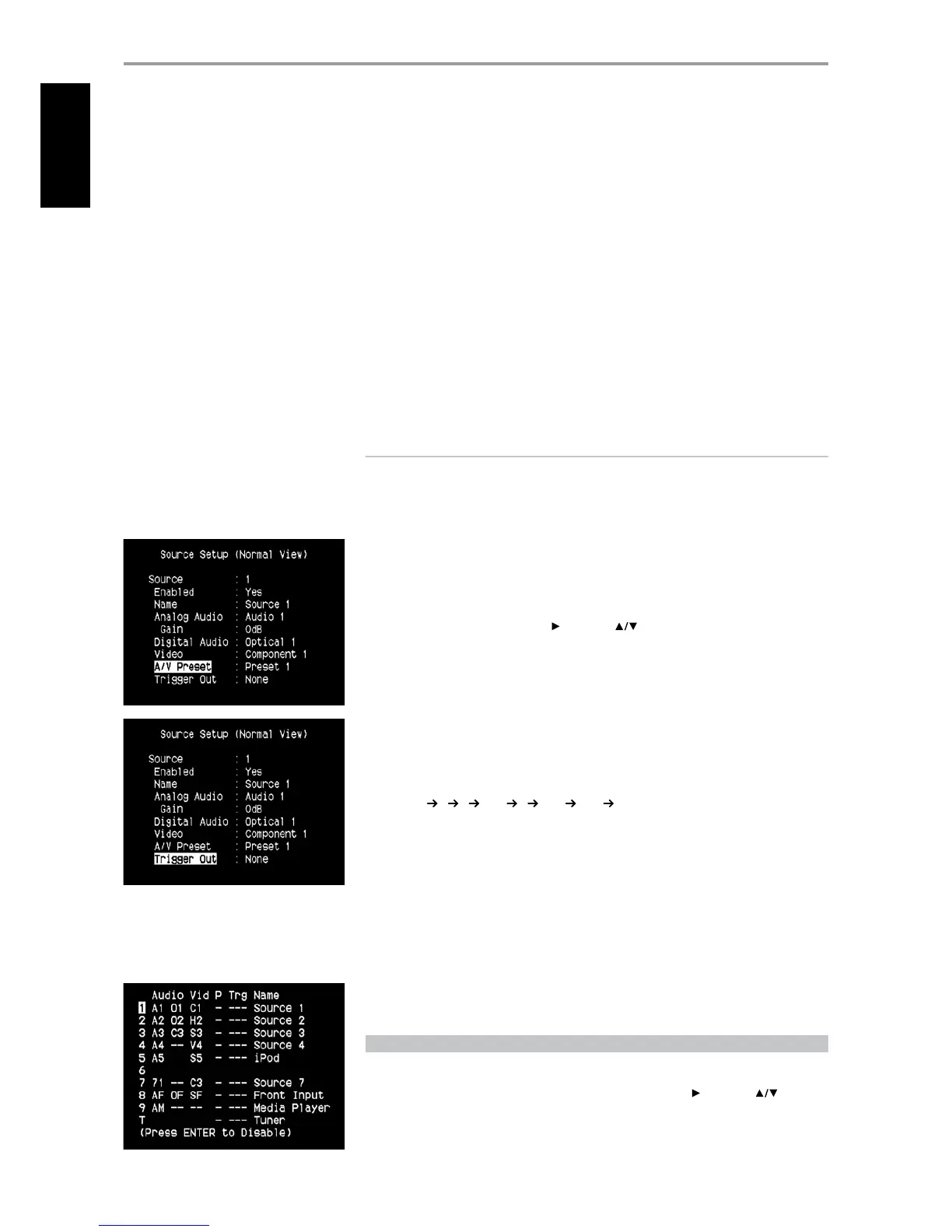 Scrolling to “A/V Preset” and by pressing [ ] and then [ ] keys, a Source could be assigned a