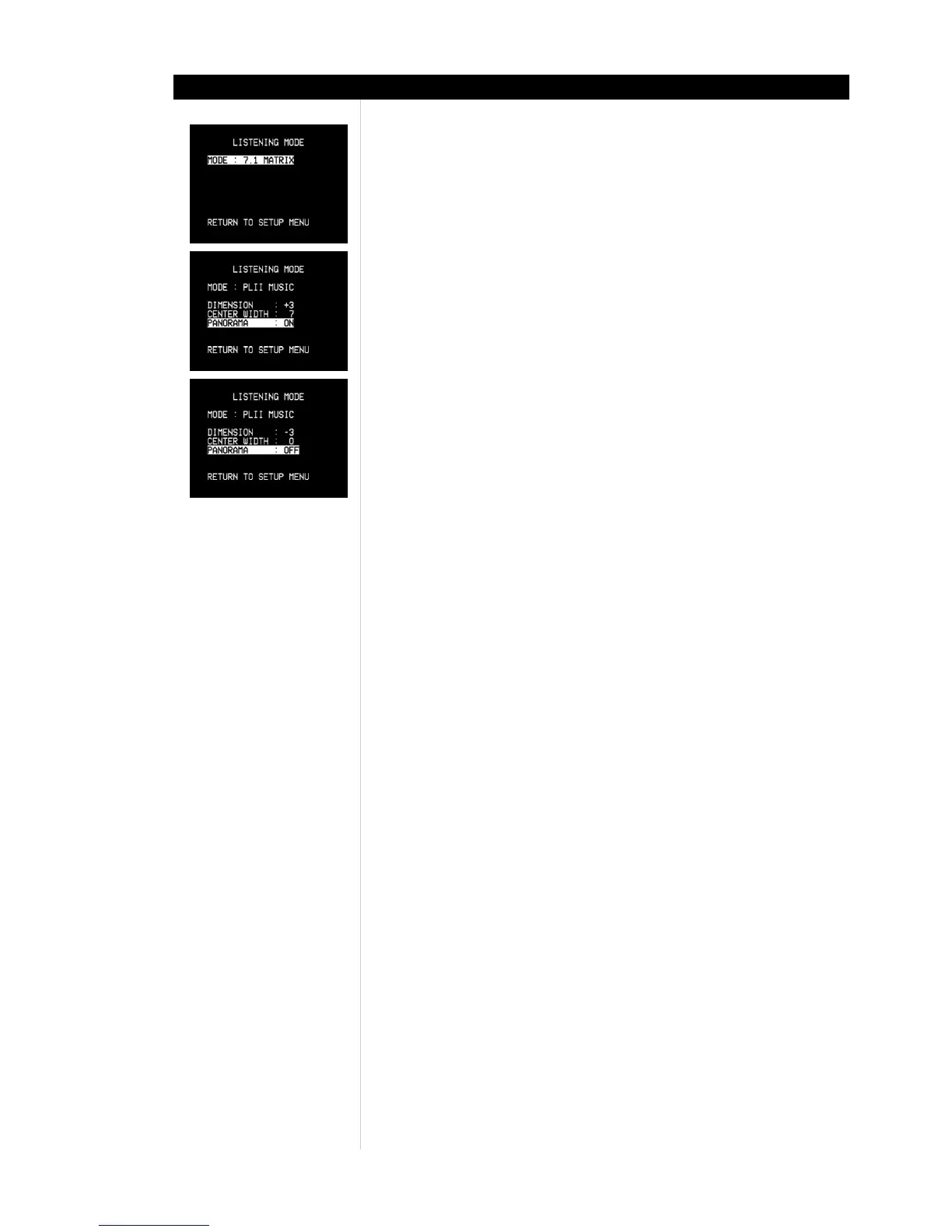 PANORAMA (ON/OFF): Adds a “wraparound” effect by extending some stereo content into the surround