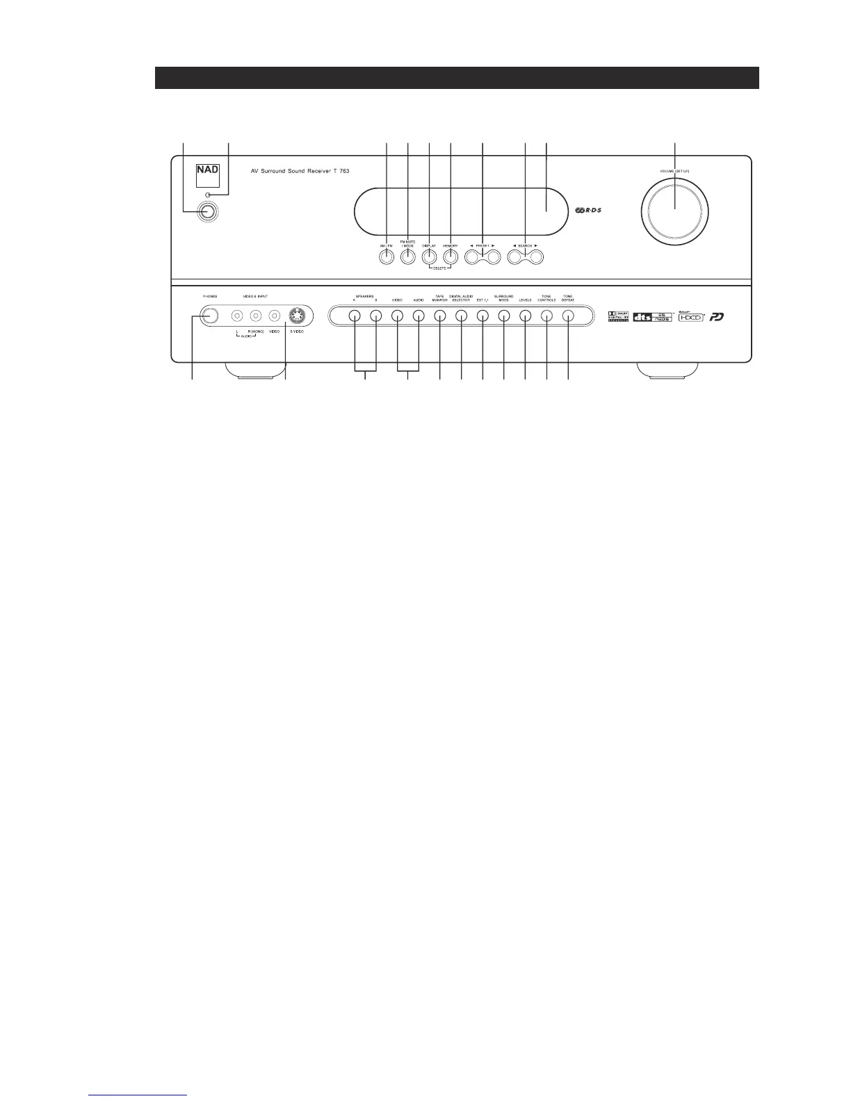 9 VFL DISPLAY: The Vacuum Fluorescent Display provides visual information on all of the T 763’s important modes, settings, and functions for both