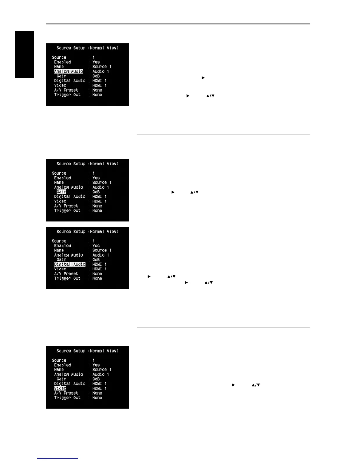 The desired digital audio input for a particular Source can be selected by scrolling to ‘Digital Audio’,