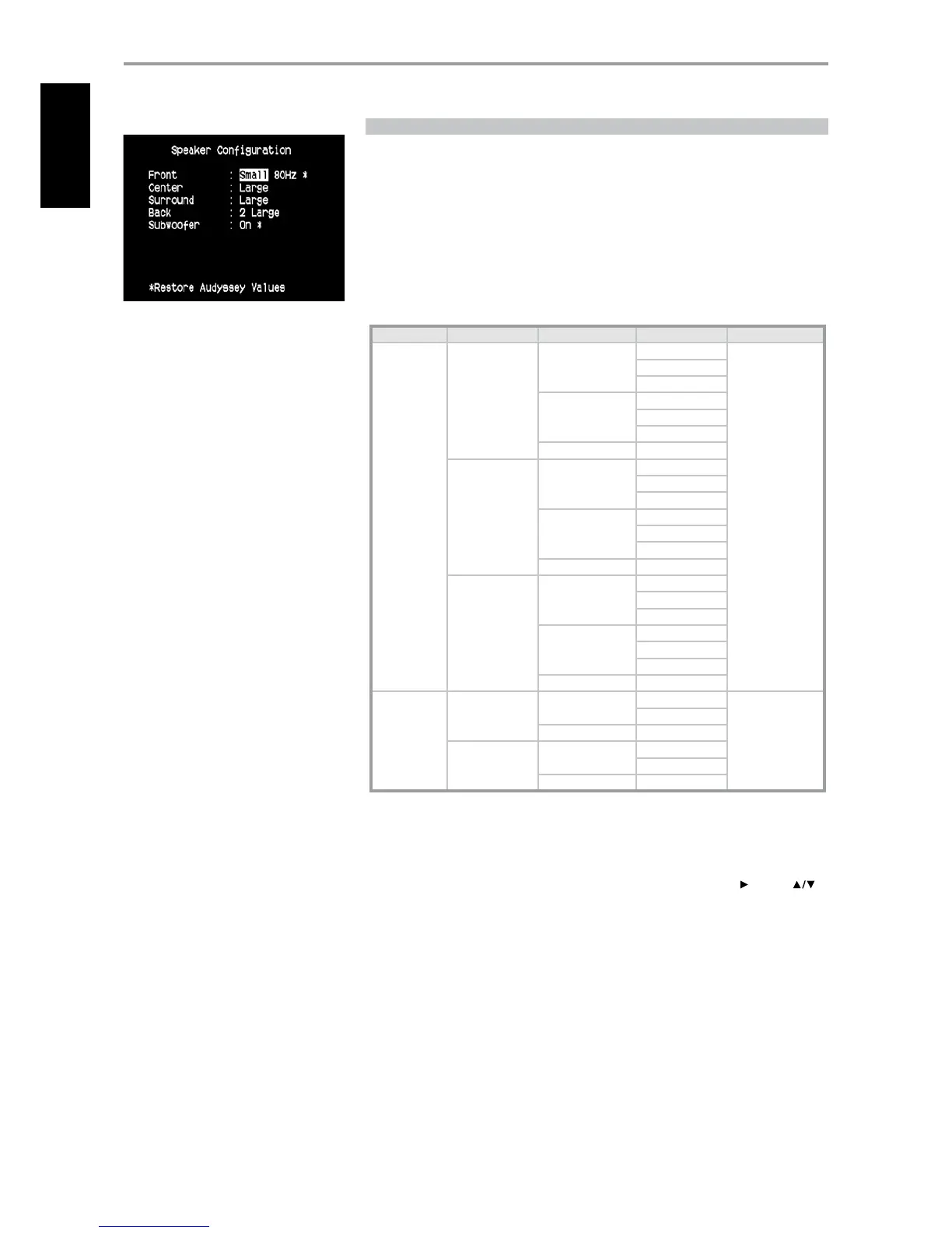 keys. Set ‘Front,’ ‘Center,’ and ‘Surround’ to “Large,” “Small” or “O” as your subsystem’s speakers require.