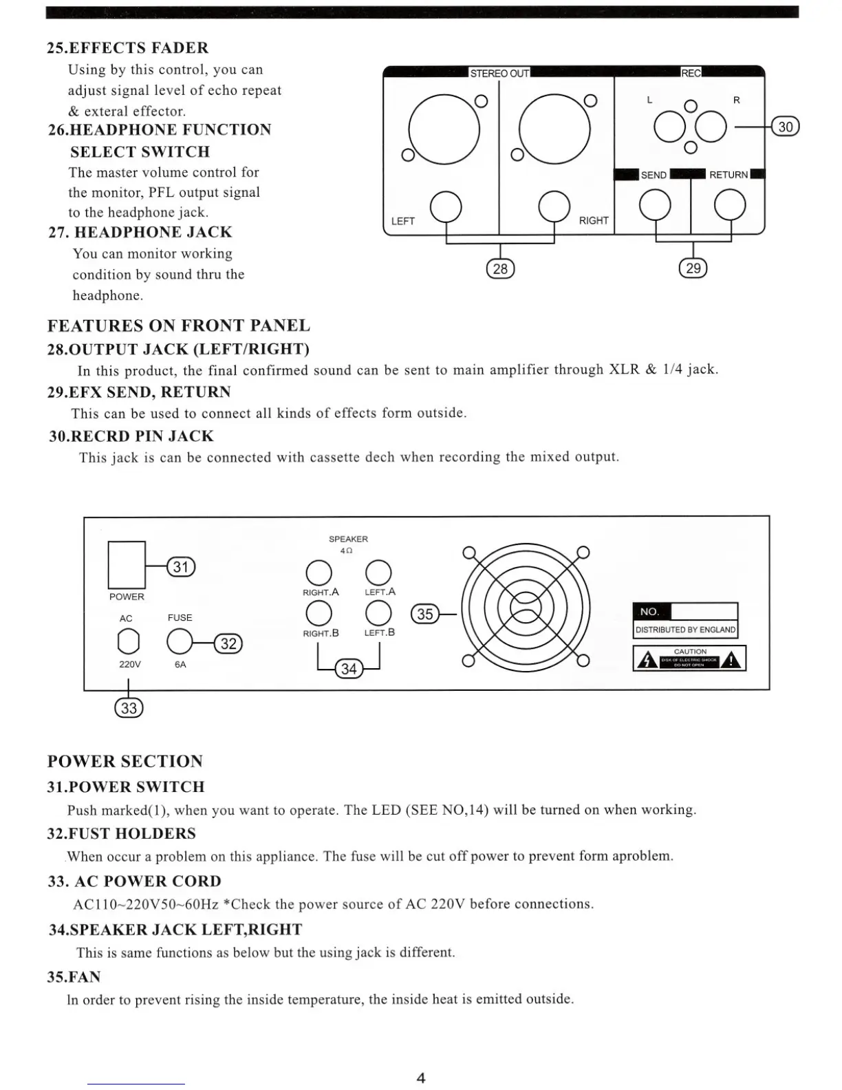 Nady Audio PMX 600 - Connectivity and Output Jacks; Power Section; Power Switch, Fuse, and Cord; Speaker Jacks and Cooling Fan
