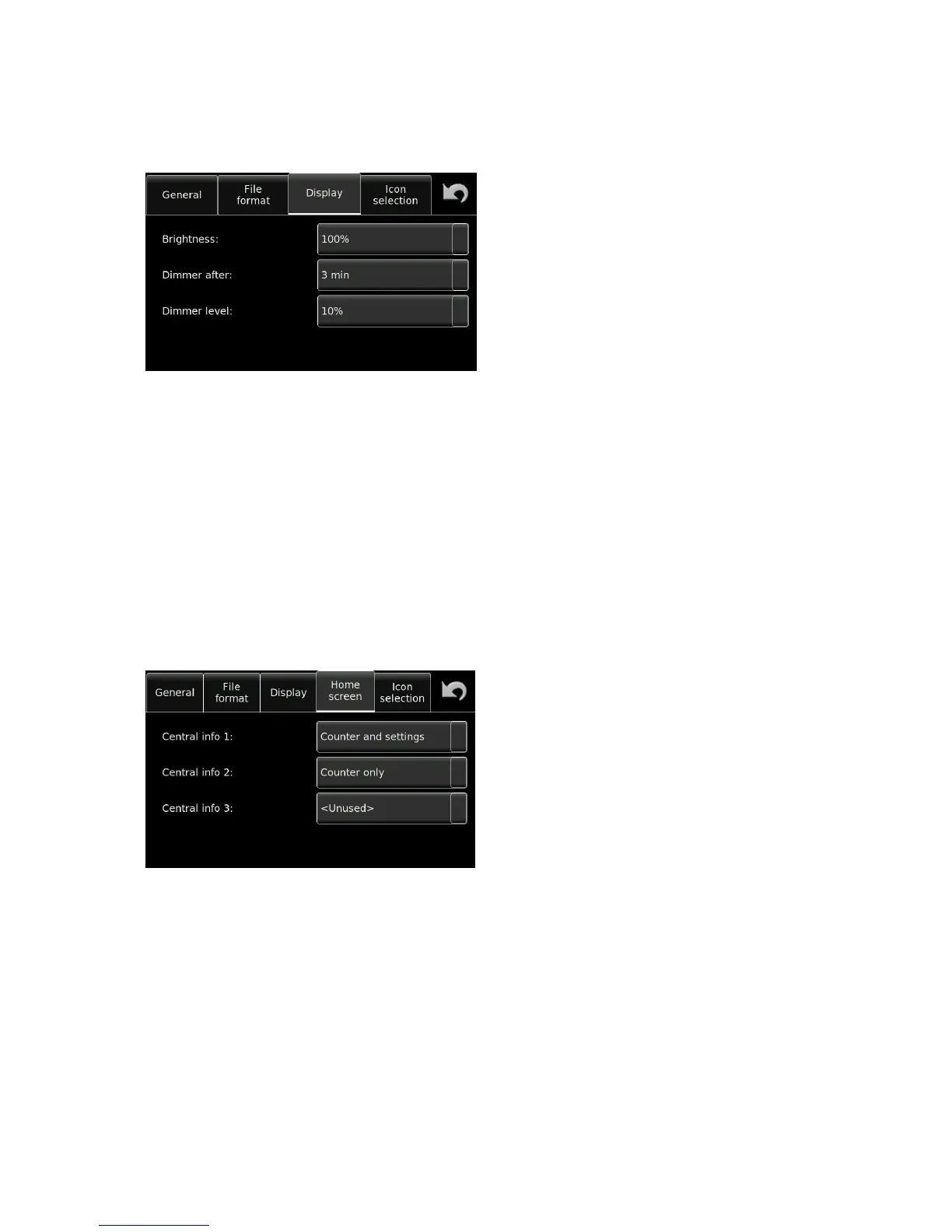 Dimmer after: Delay before the display switches to low power mode. This can be set to 30s, 1min,